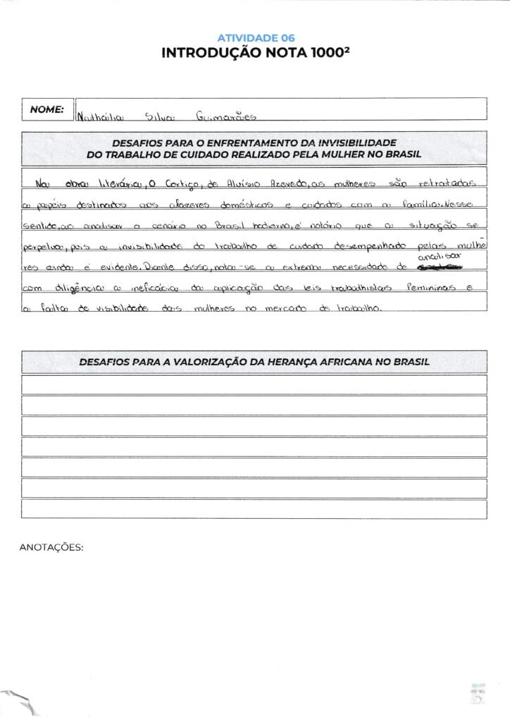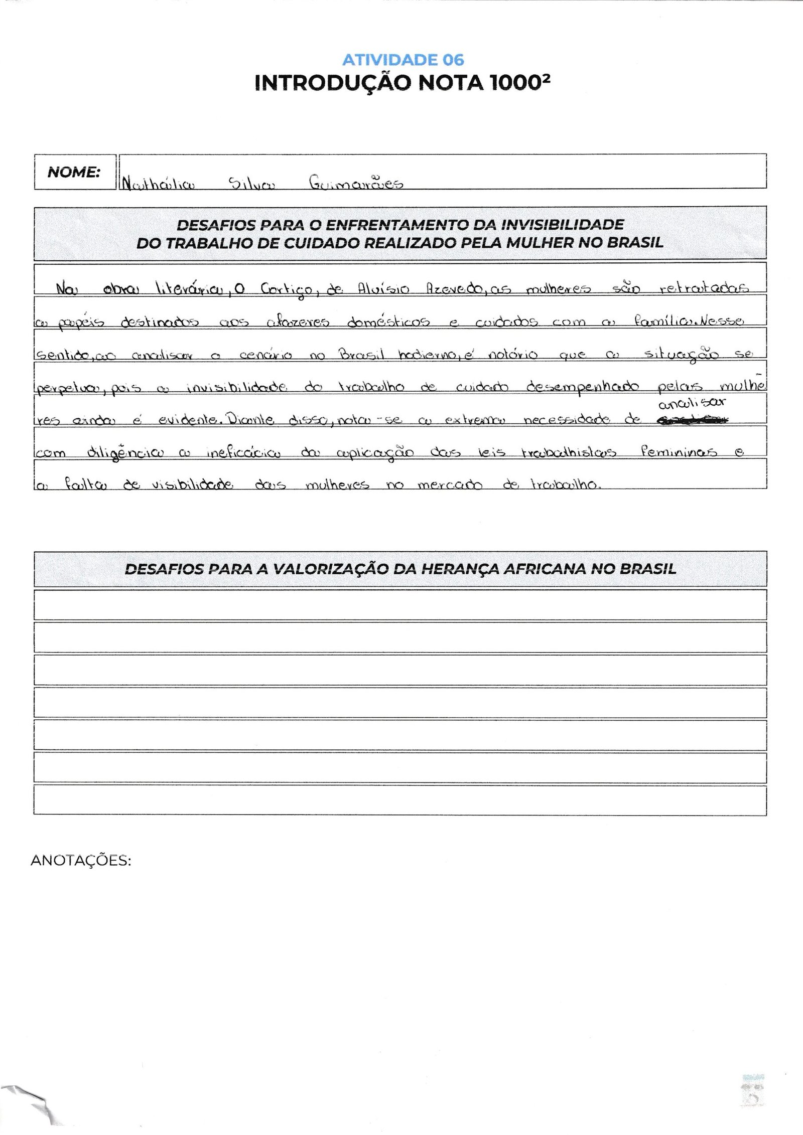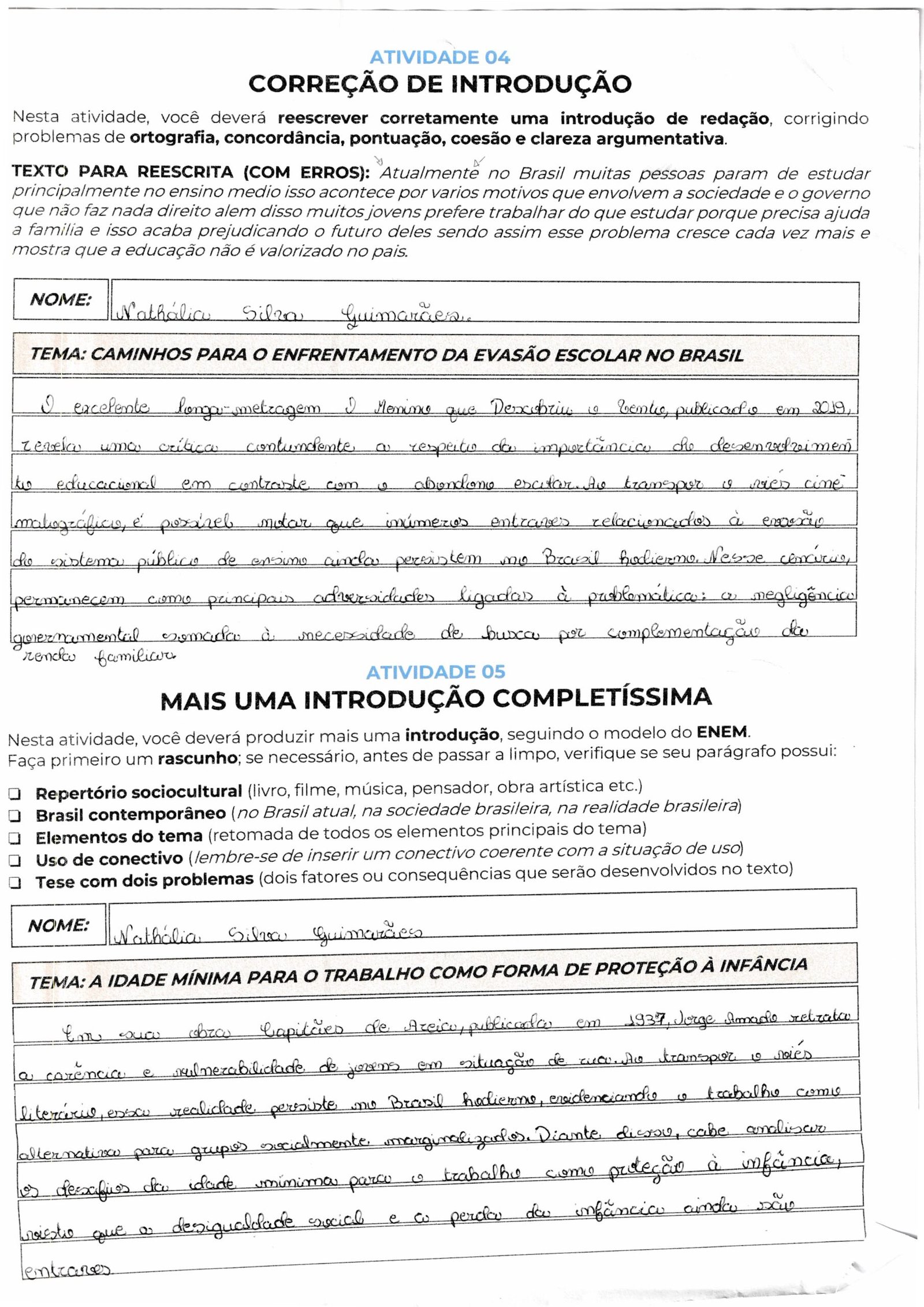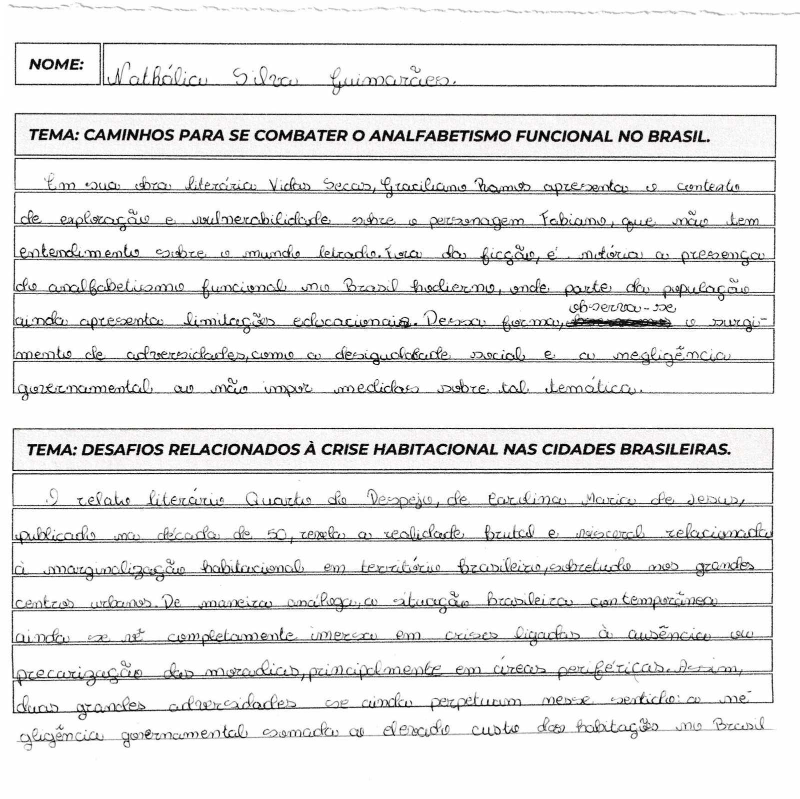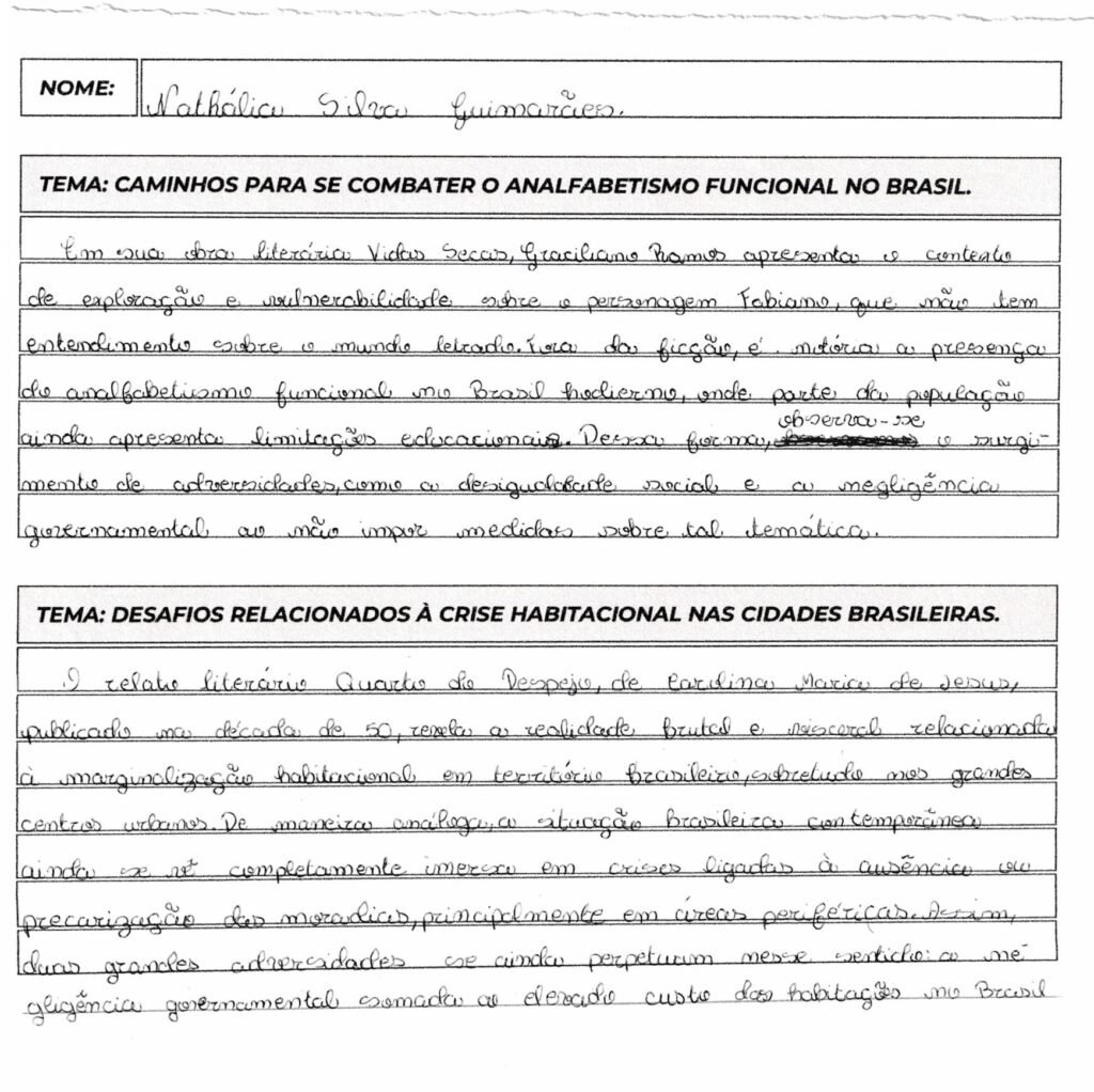 Nathália Silva Guimarães, sua introdução apresenta um excelente domínio da estrutura exigida para o ENEM ao utilizar “Vidas Secas” para contextualizar a vulnerabilidade do personagem Fabiano diante do mundo letrado. Sua tese bipartida está claramente definida nos eixos da desigualdade social e da negligência governamental.