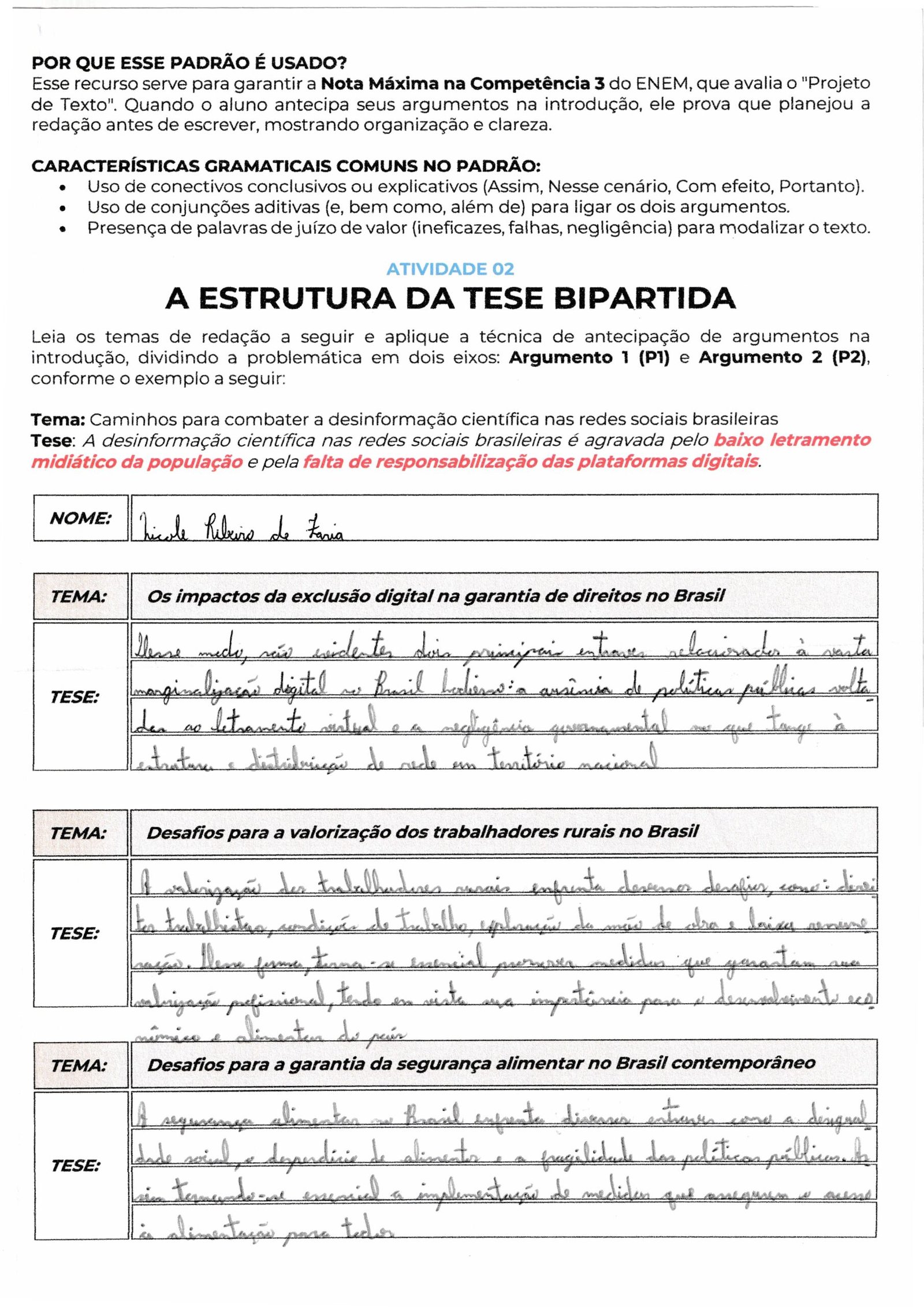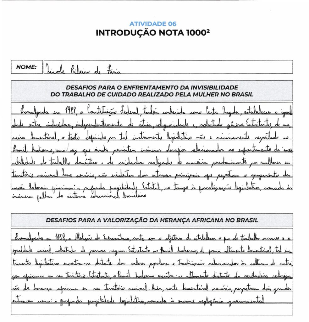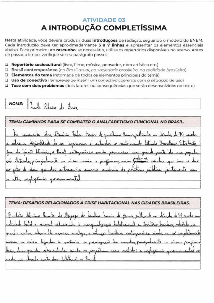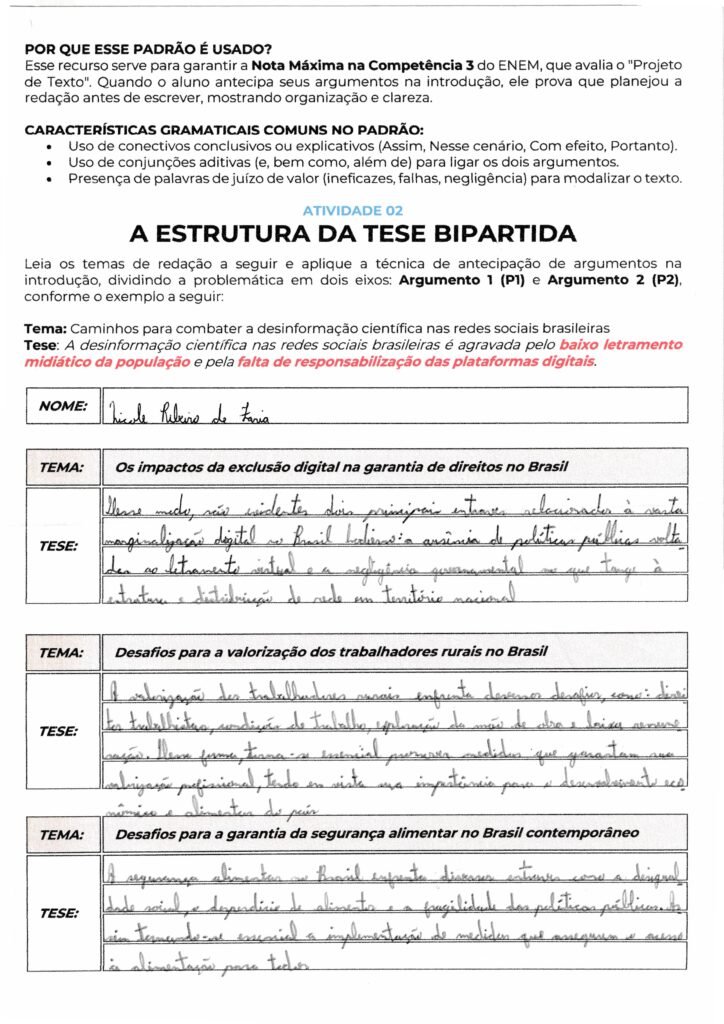 Sua caligrafia é legível e o uso de conectivos como “Entretanto” e “Fora da ficção literária” garante a fluidez necessária, mas procure evitar repetições de ideias similares na tese (políticas públicas e negligência governamental costumam andar juntas; talvez valha diferenciar um eixo para a “falha educacional” ou “desigualdade social”).