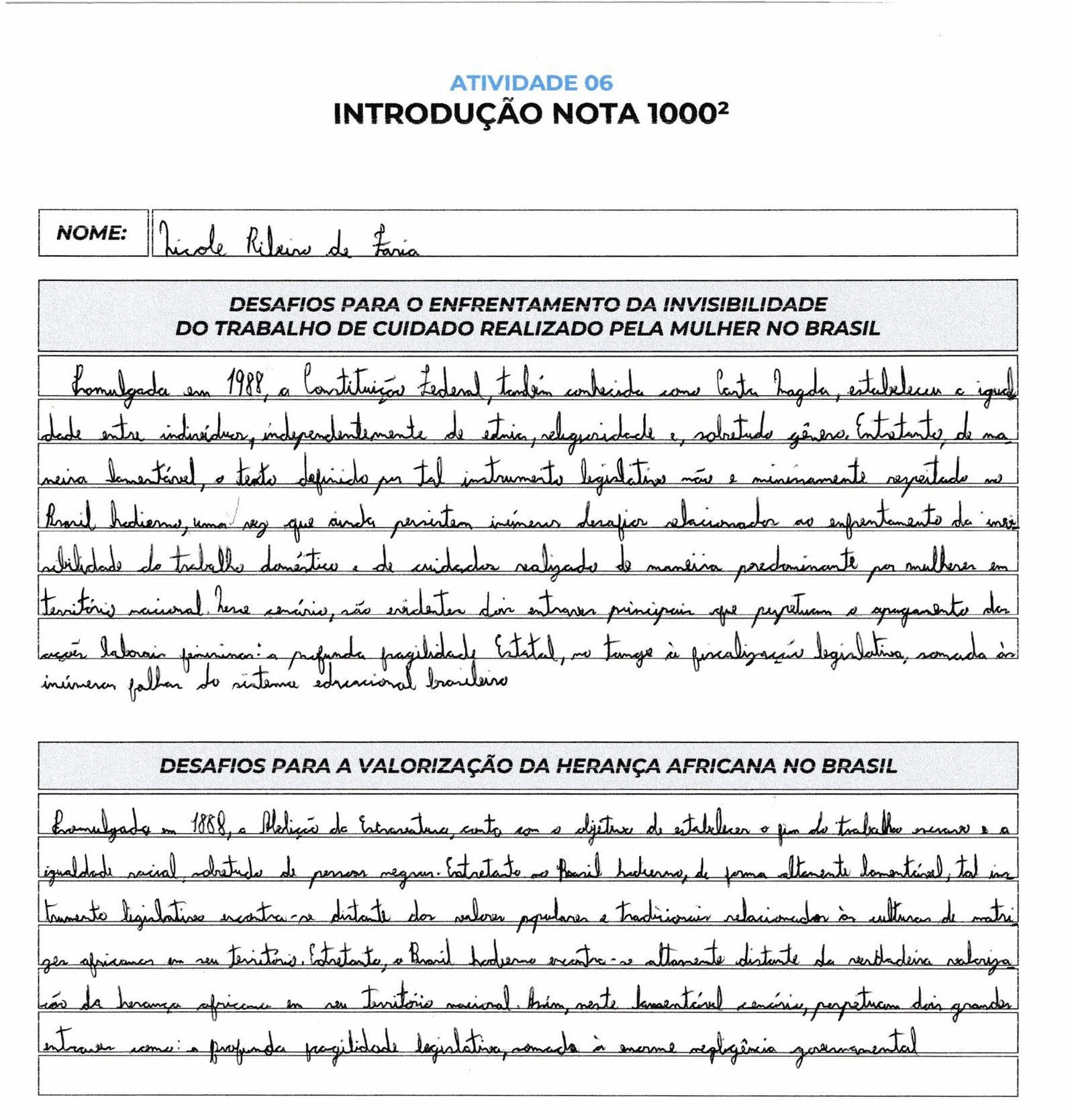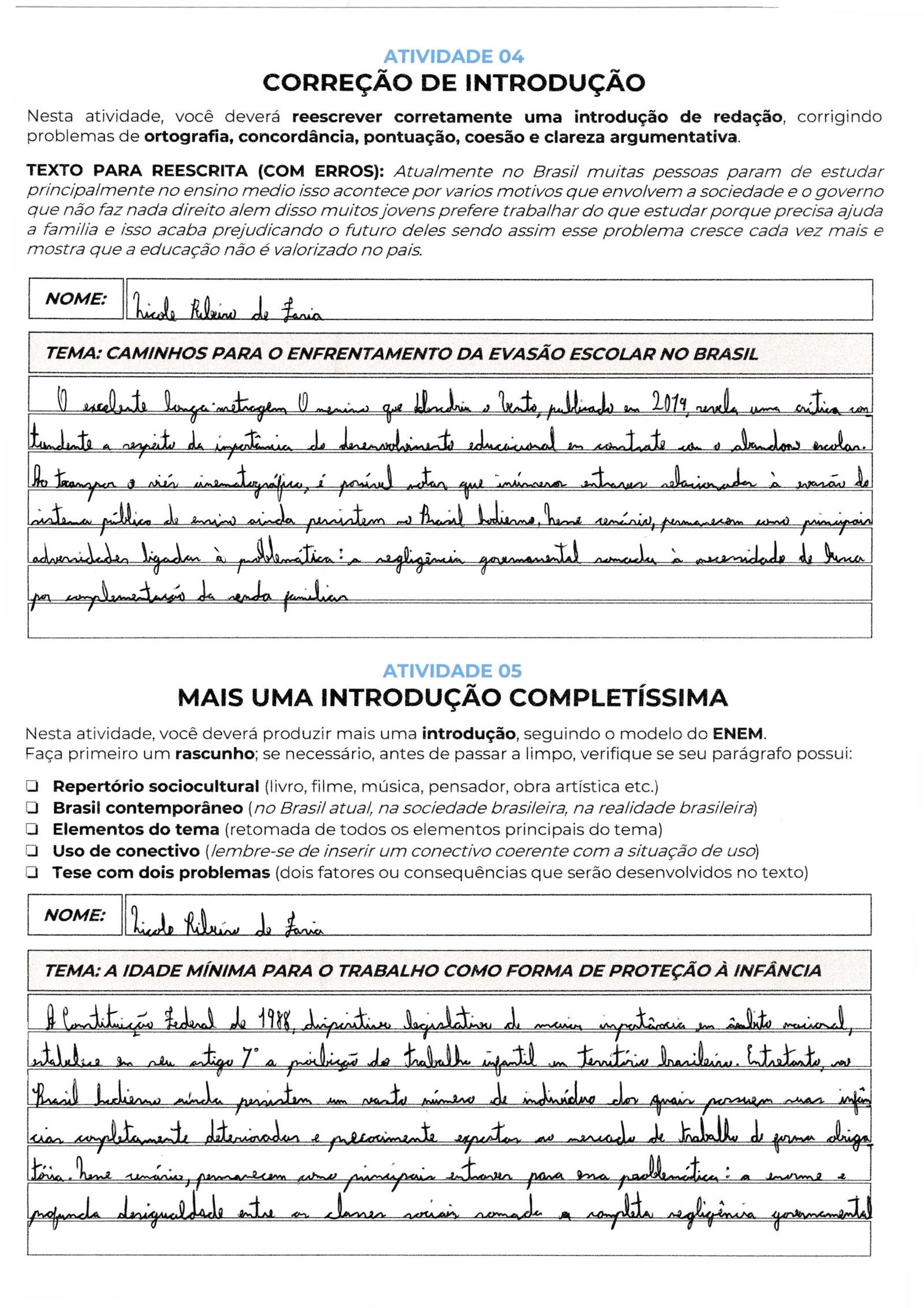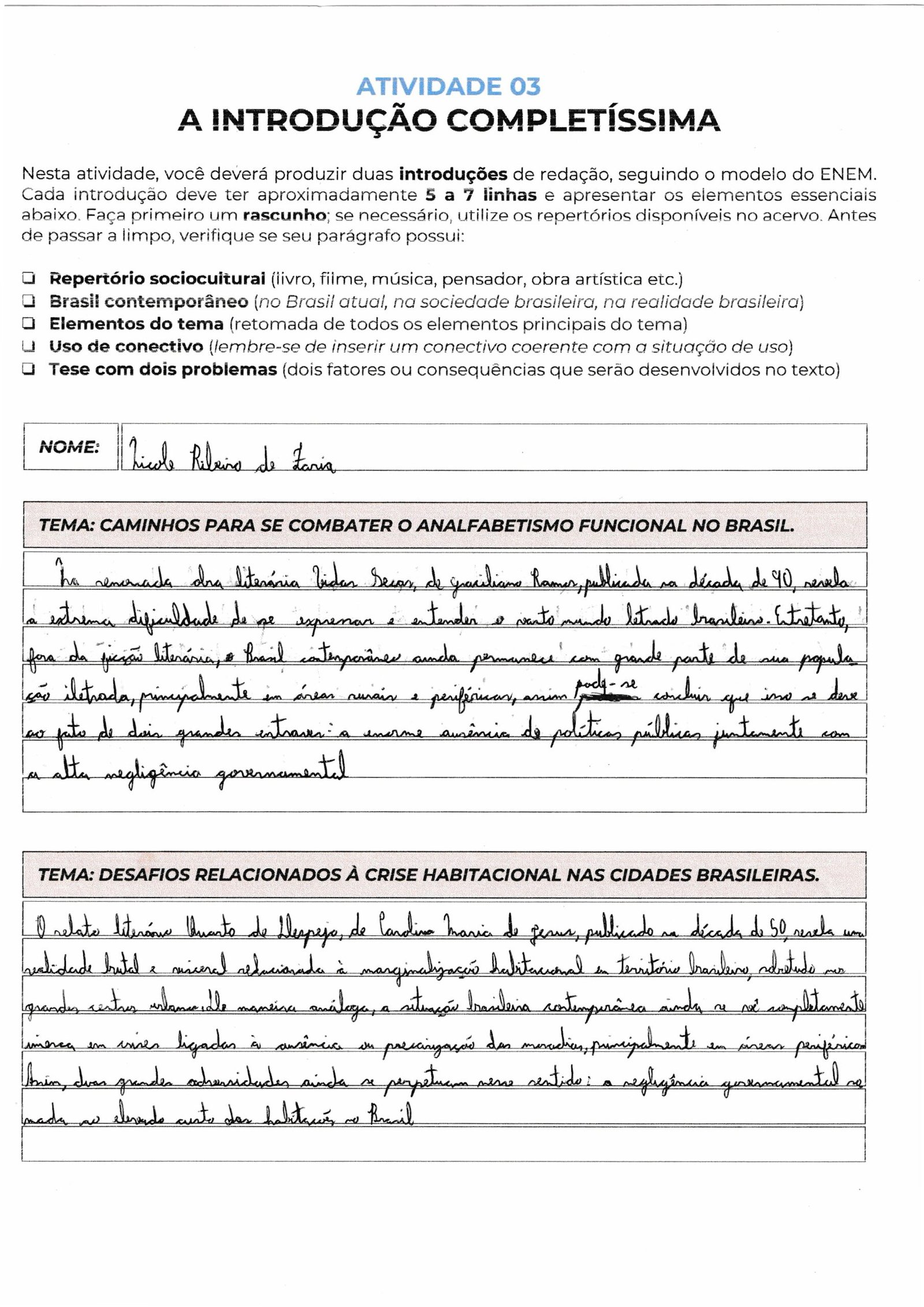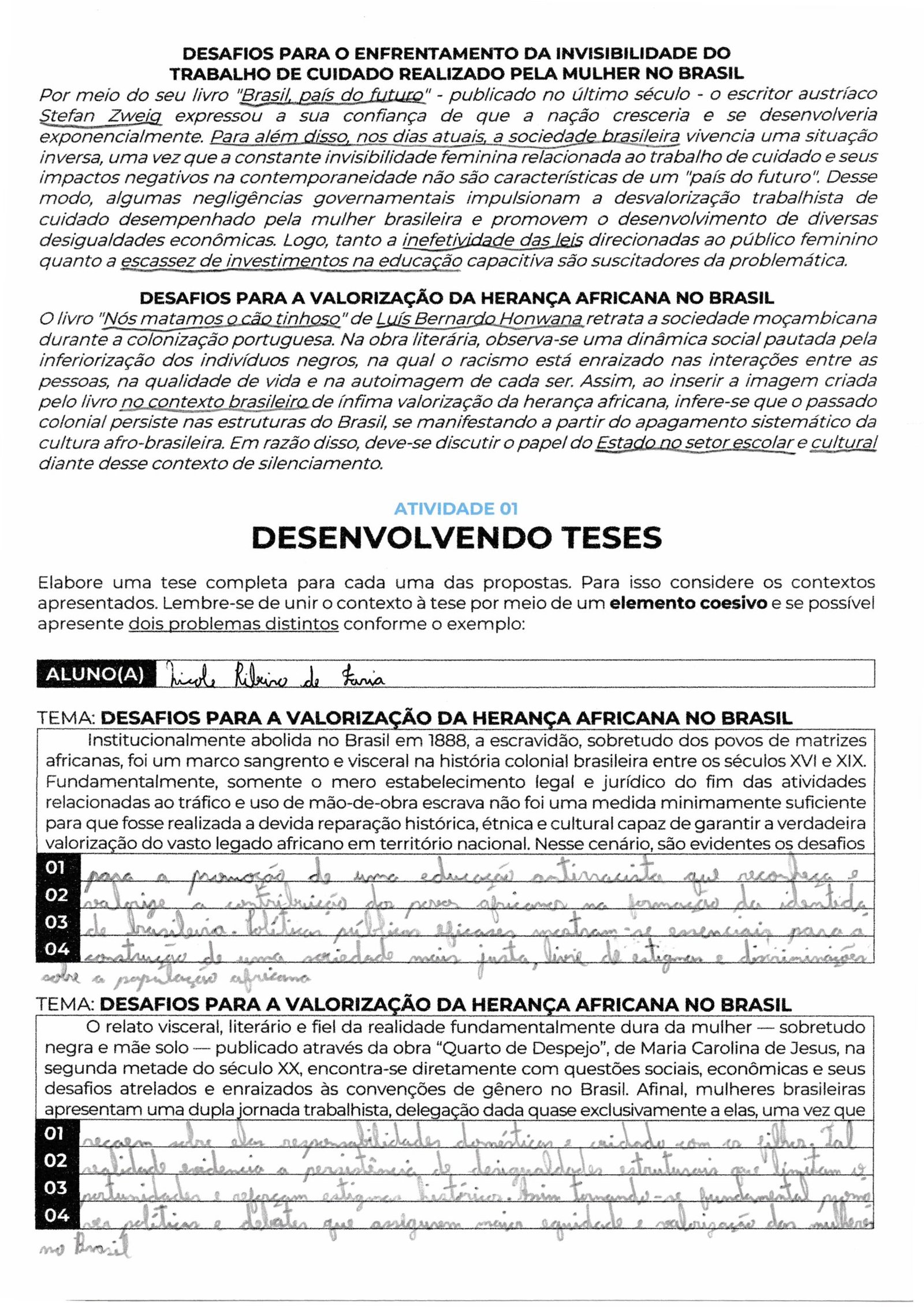 Sua caligrafia é legível e o uso de conectivos como “Entretanto” e “Fora da ficção literária” garante a fluidez necessária, mas procure evitar repetições de ideias similares na tese (políticas públicas e negligência governamental costumam andar juntas; talvez valha diferenciar um eixo para a “falha educacional” ou “desigualdade social”).