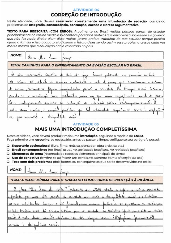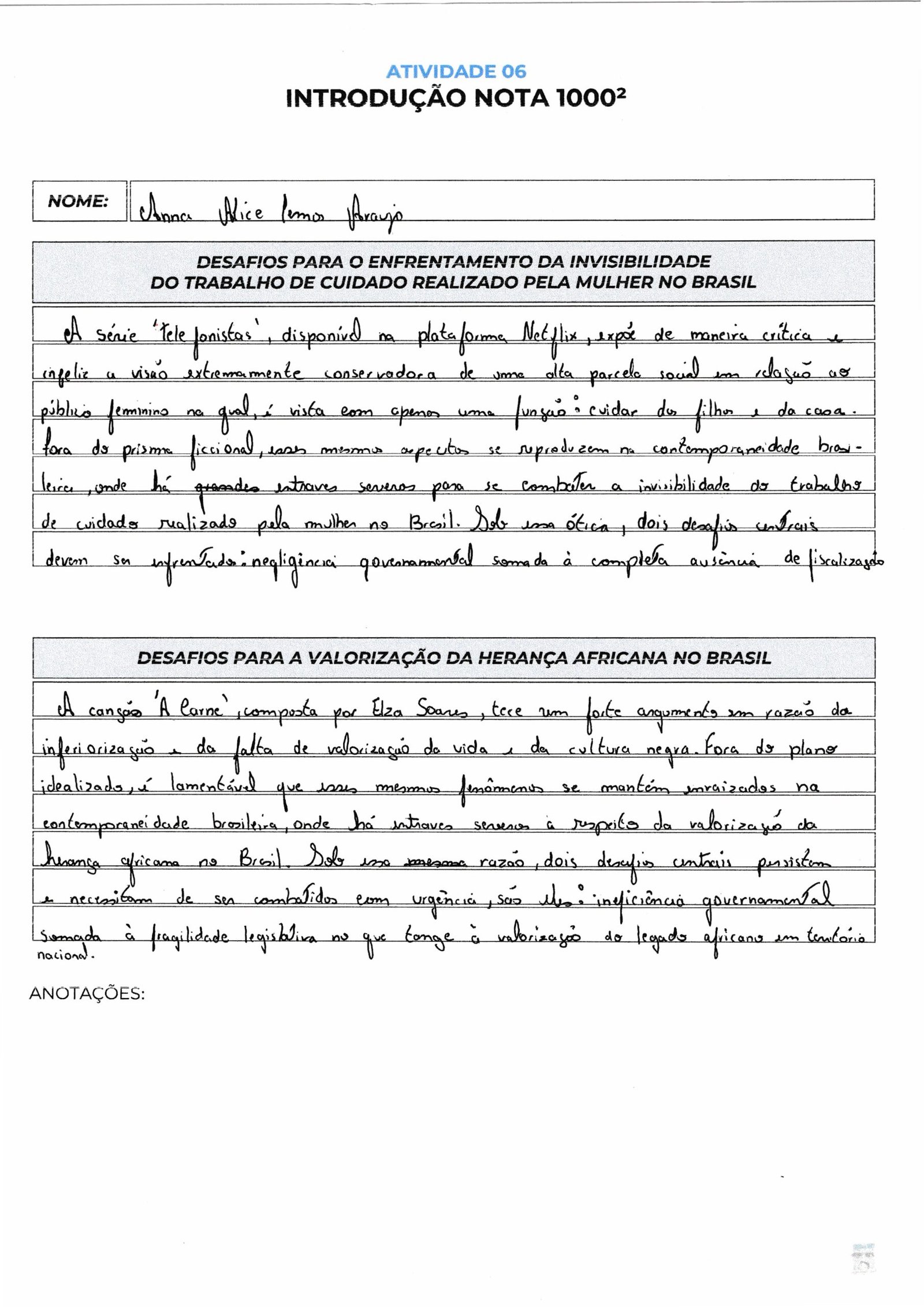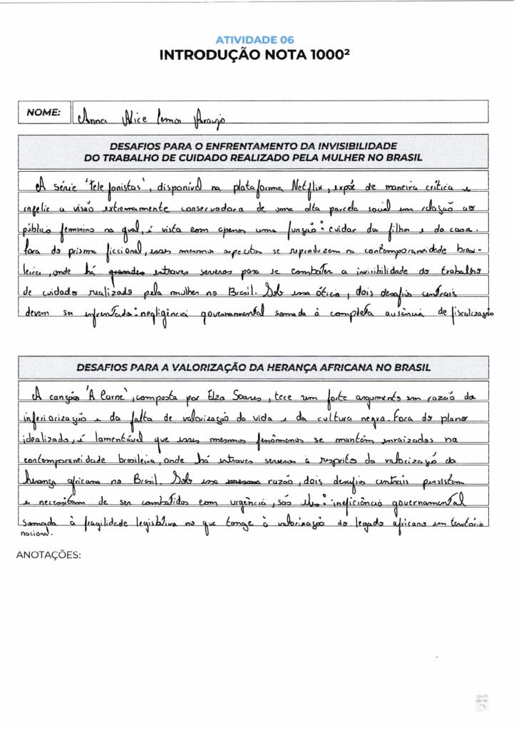 Anna Alice, seus textos estão excelentes! Quero começar elogiando muito o seu uso diversificado de repertório sociocultural. Você demonstrou uma bagagem cultural riquíssima ao transitar com facilidade entre uma série contemporânea como “As Telefonistas” e a força da música brasileira na voz de Elza Soares com “A Carne”. Essa variedade é muito valorizada pelos corretores, pois mostra que você consegue aplicar diferentes tipos de conhecimento à argumentação.