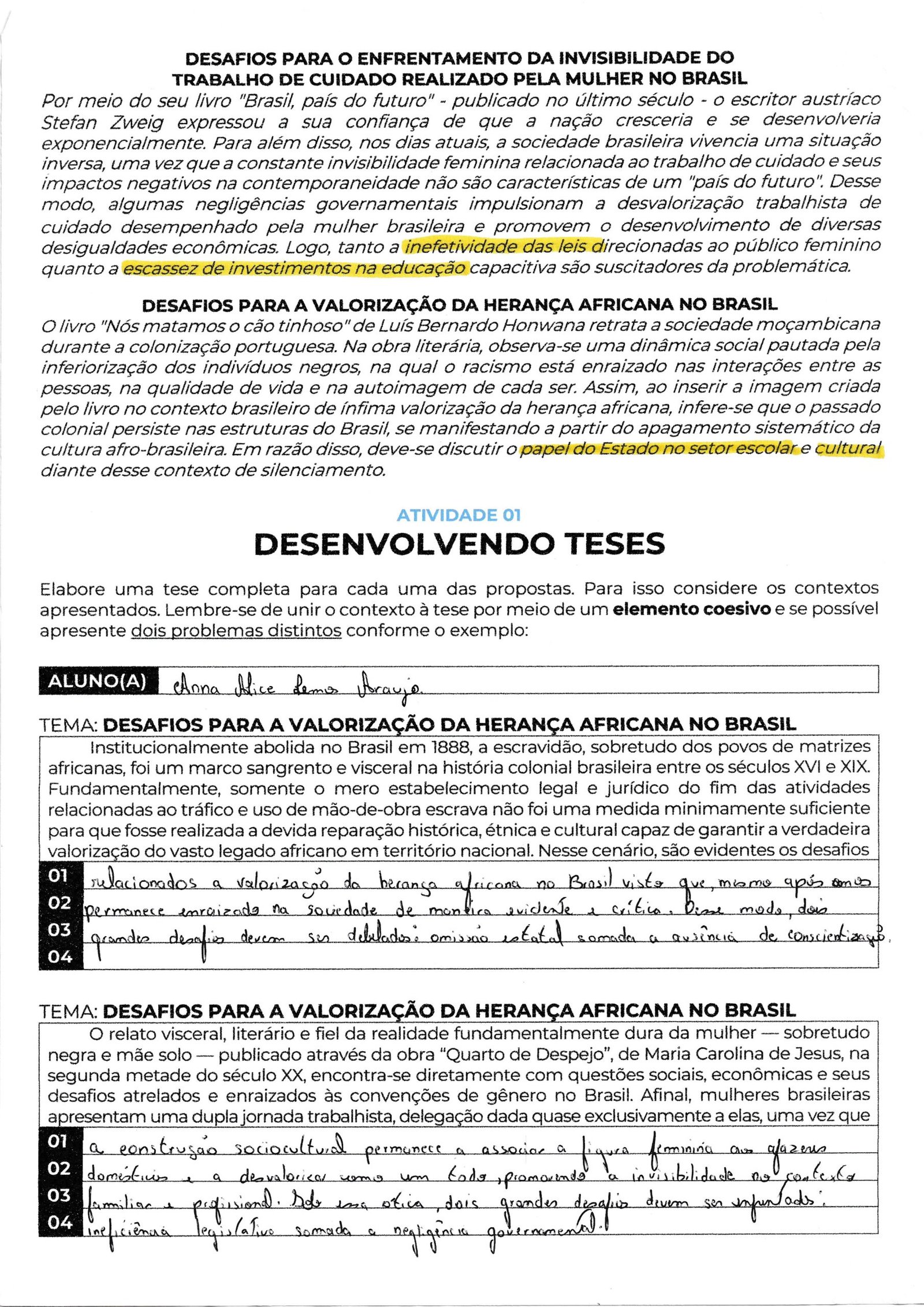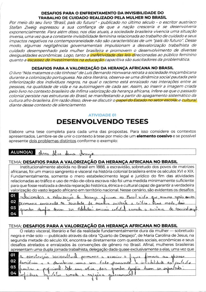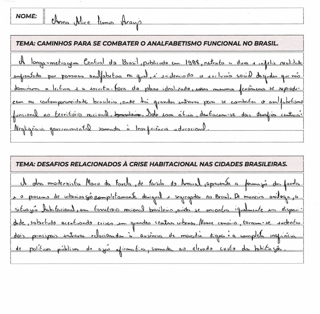 Para alcançar a perfeição na Competência 1, atente-se apenas a alguns detalhes de escrita manual: em “contemporaneidade“, o ‘i’ ficou um pouco escondido, e em “negligência“, cuidado com a acentuação. Além disso, lembre-se de que o termo “onde” deve ser usado preferencialmente para lugares físicos; em contextos abstratos como “contemporaneidade brasileira”, você pode substituir por “na qual” ou “em que” para tornar o texto ainda mais sofisticado.