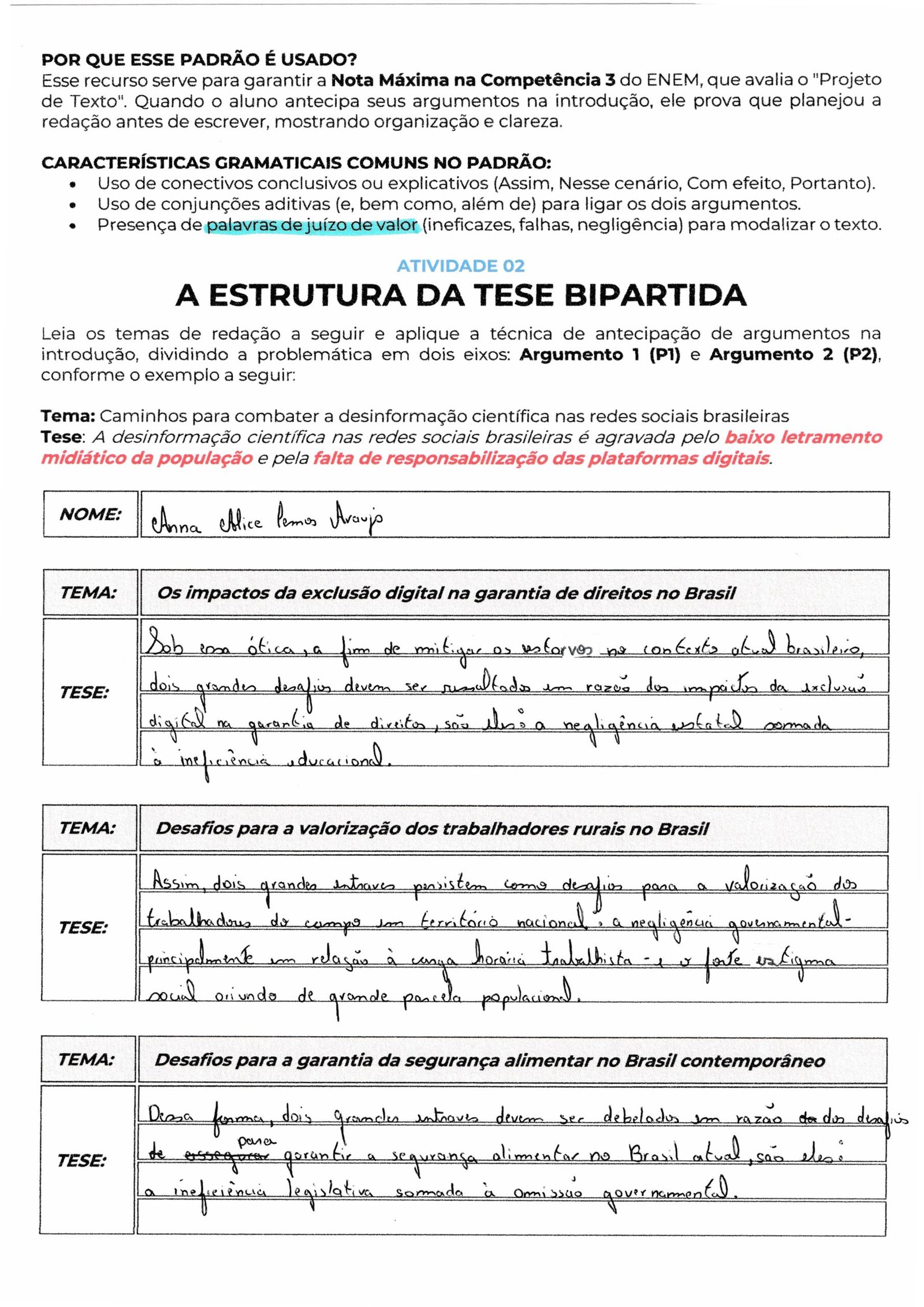 Suas introduções seguem perfeitamente o modelo exigido: você apresenta o contexto, faz a ponte para o Brasil atual com ótimos conectivos (como “Fora do prisma ficcional” e “Sob essa mesma razão“) e encerra com teses bipartidas muito bem construídas. Na primeira, você foca na negligência governamental e na ausência de fiscalização, e na segunda, aborda a ineficiência governamental e a fragilidade legislativa.