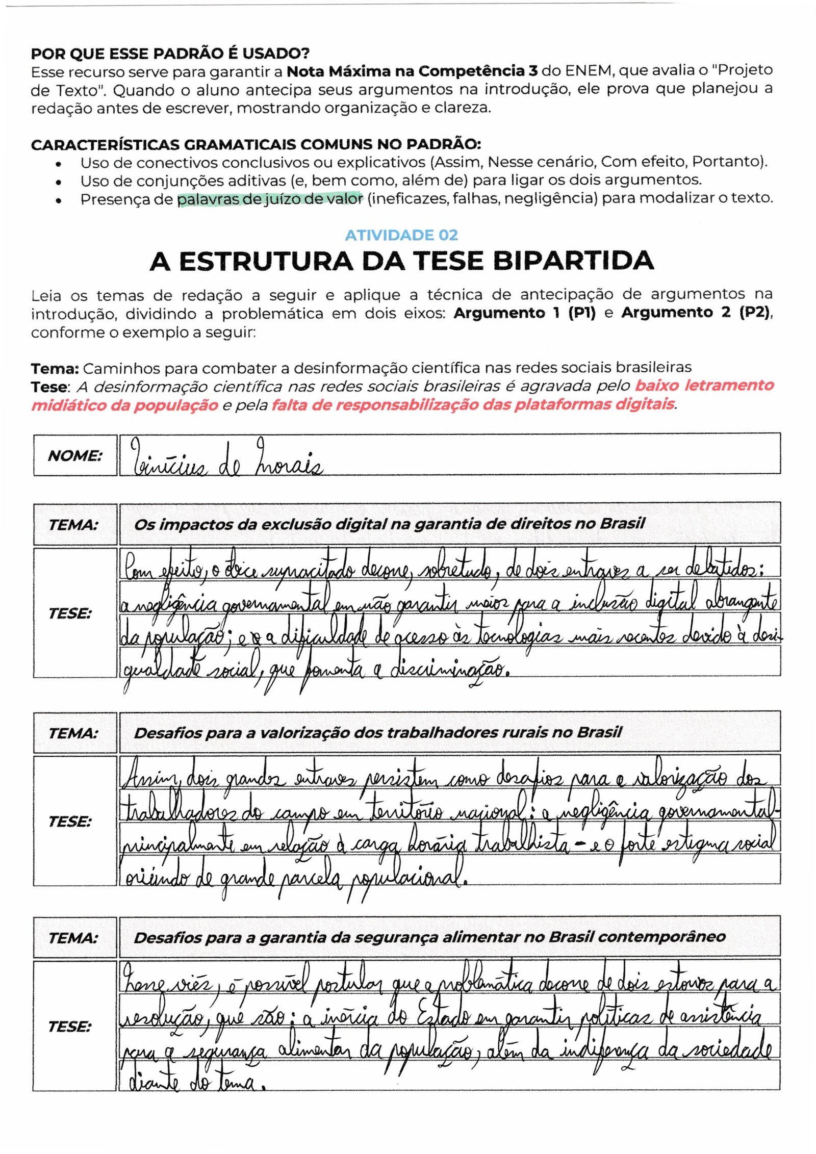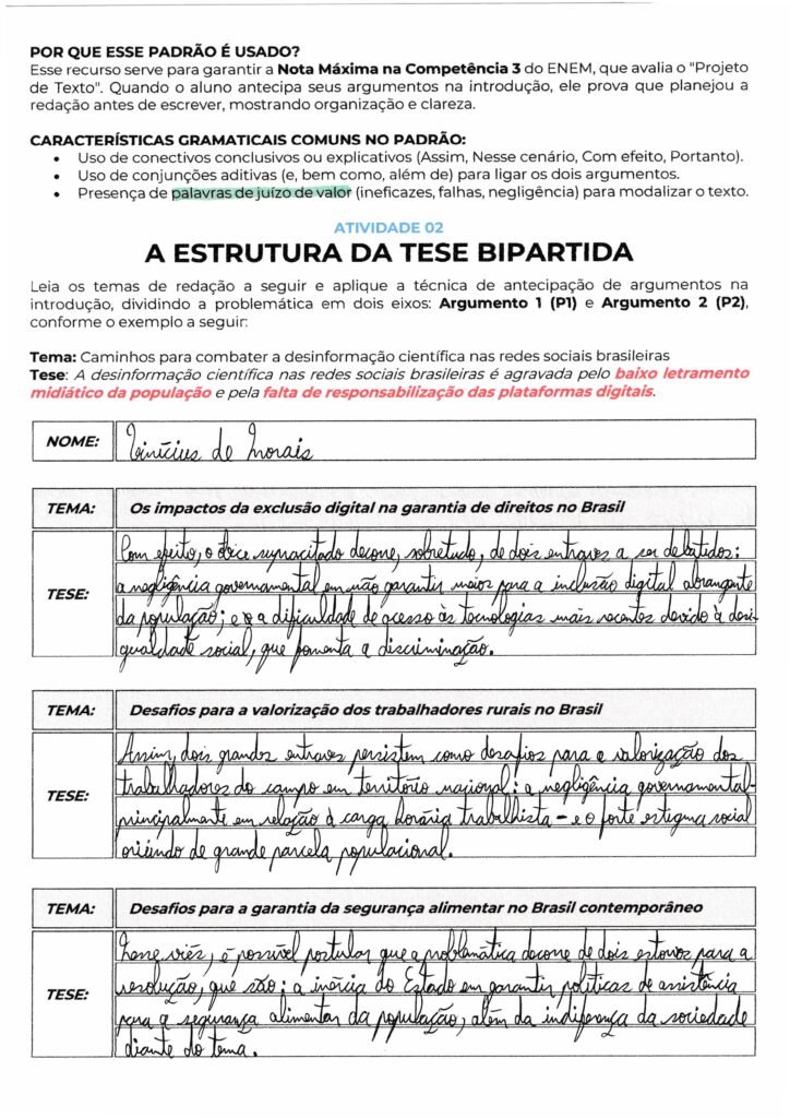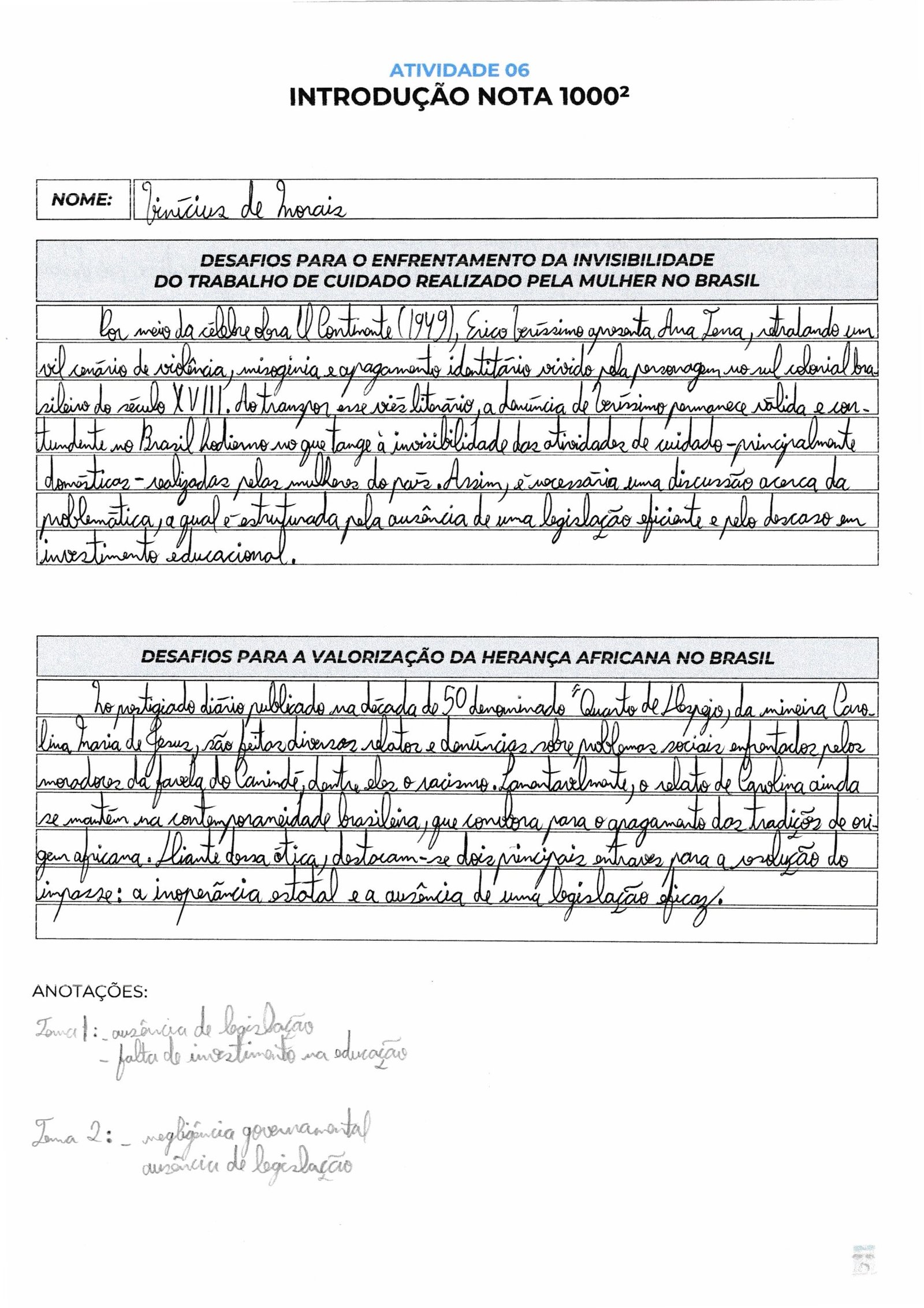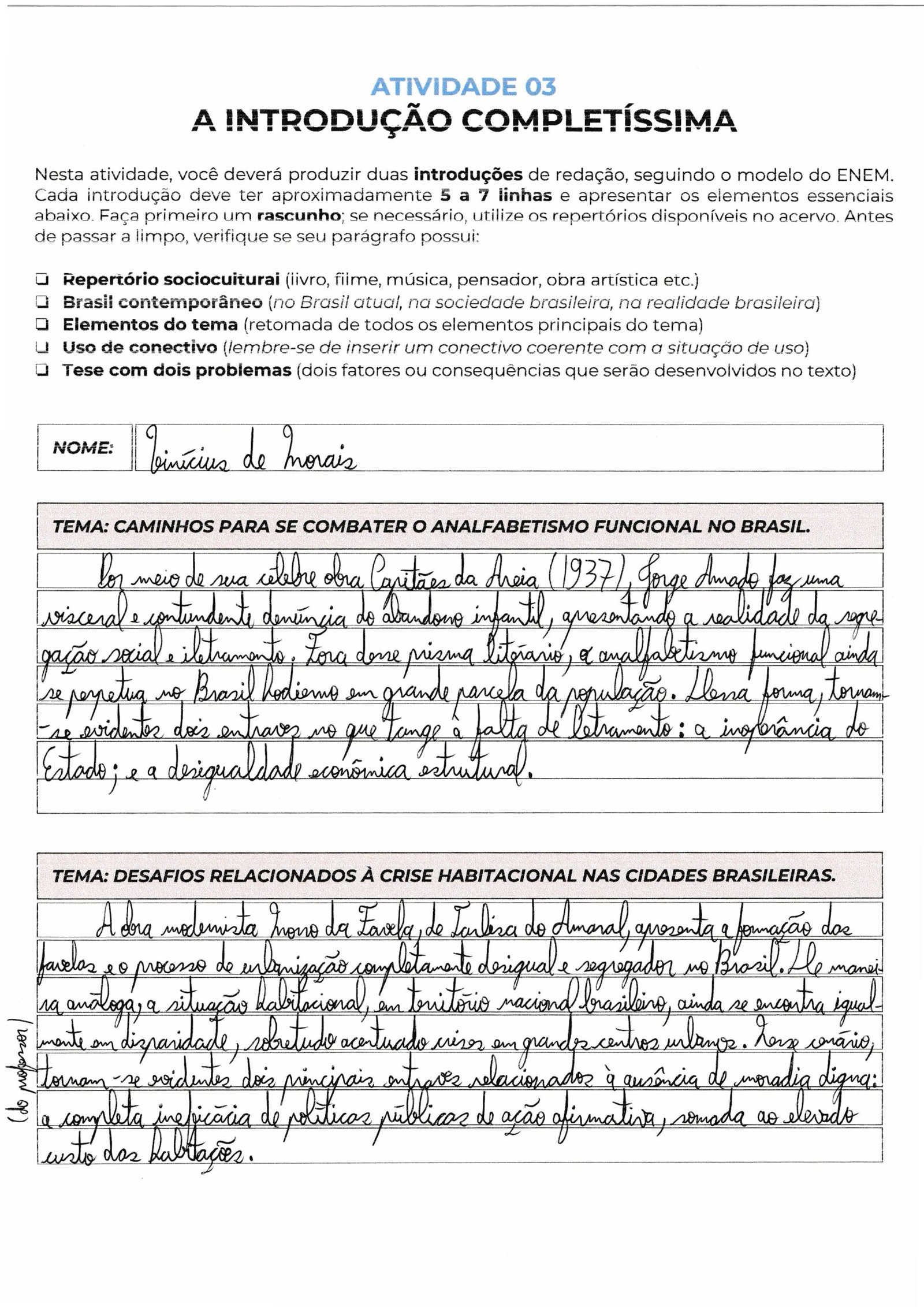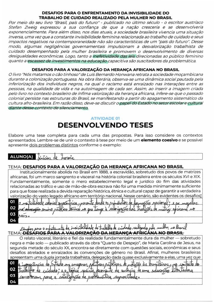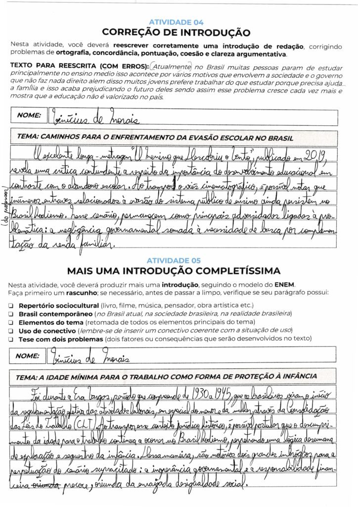 Para qualificar sua escrita conforme a orientação para o grupo, em vez de citar apenas “desigualdade social”, utilize a expressão indivíduos em situação de vulnerabilidade socioeconômica para descrever o perfil populacional que sofre com a “lógica desumana de exploração”. Para elevar a nota na Competência 1, atente-se à regência e à pontuação: em “período que compreende de 1930 a 1945”, o verbo é direto, sendo o ideal “período que compreende os anos de 1930 a 1945“. Além disso, revise a acentuação em palavras como período e a grafia de imbróglios.