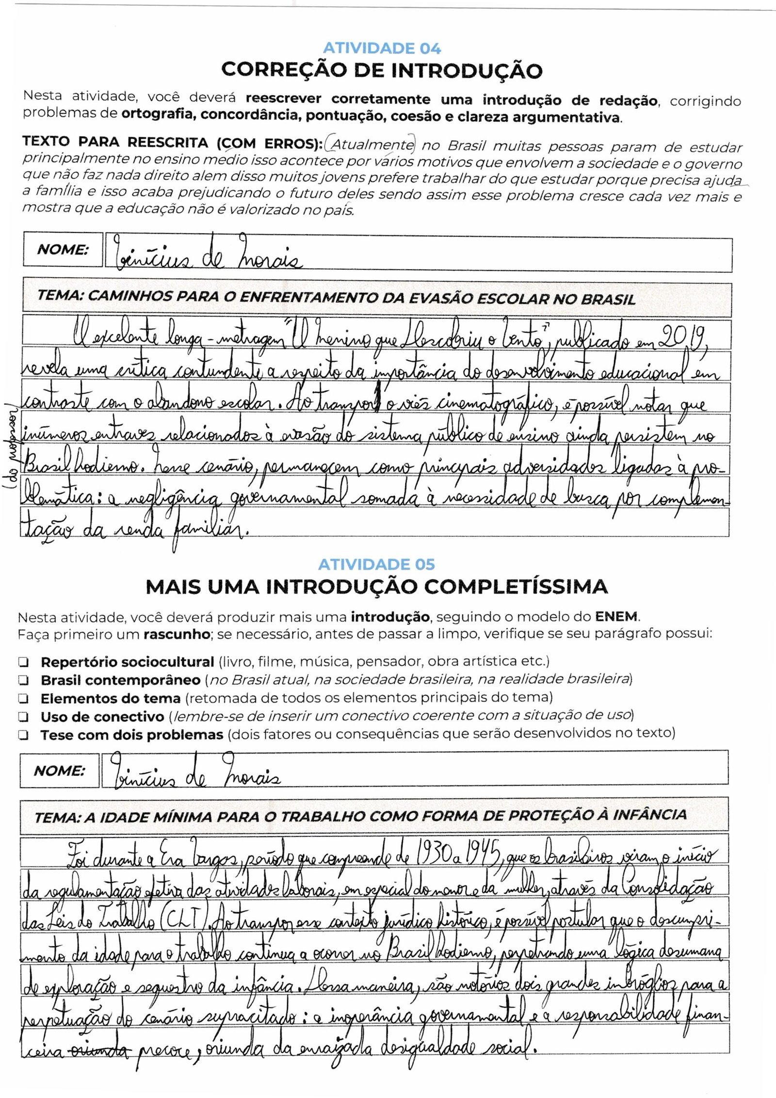Vinícius, sua introdução utiliza de forma produtiva o contexto histórico da Era Vargas e da criação da CLT para fundamentar o início da regulamentação do trabalho no Brasil, demonstrando um excelente domínio de repertório legitimado. Sua tese bipartida está muito bem definida nos eixos da inoperância governamental e da responsabilidade financeira precoce oriunda da desigualdade social, o que garante um projeto de texto sólido e sofisticado.