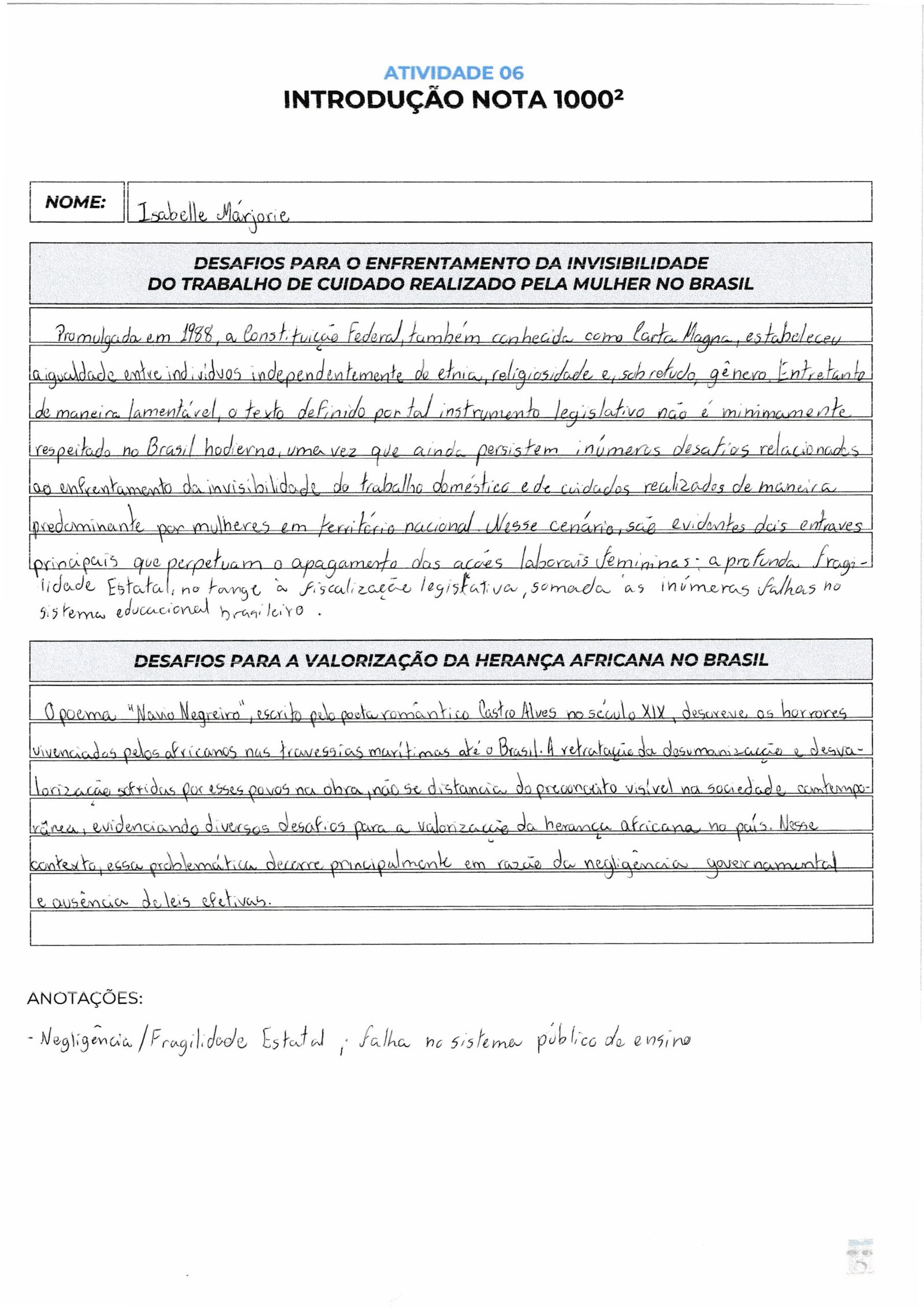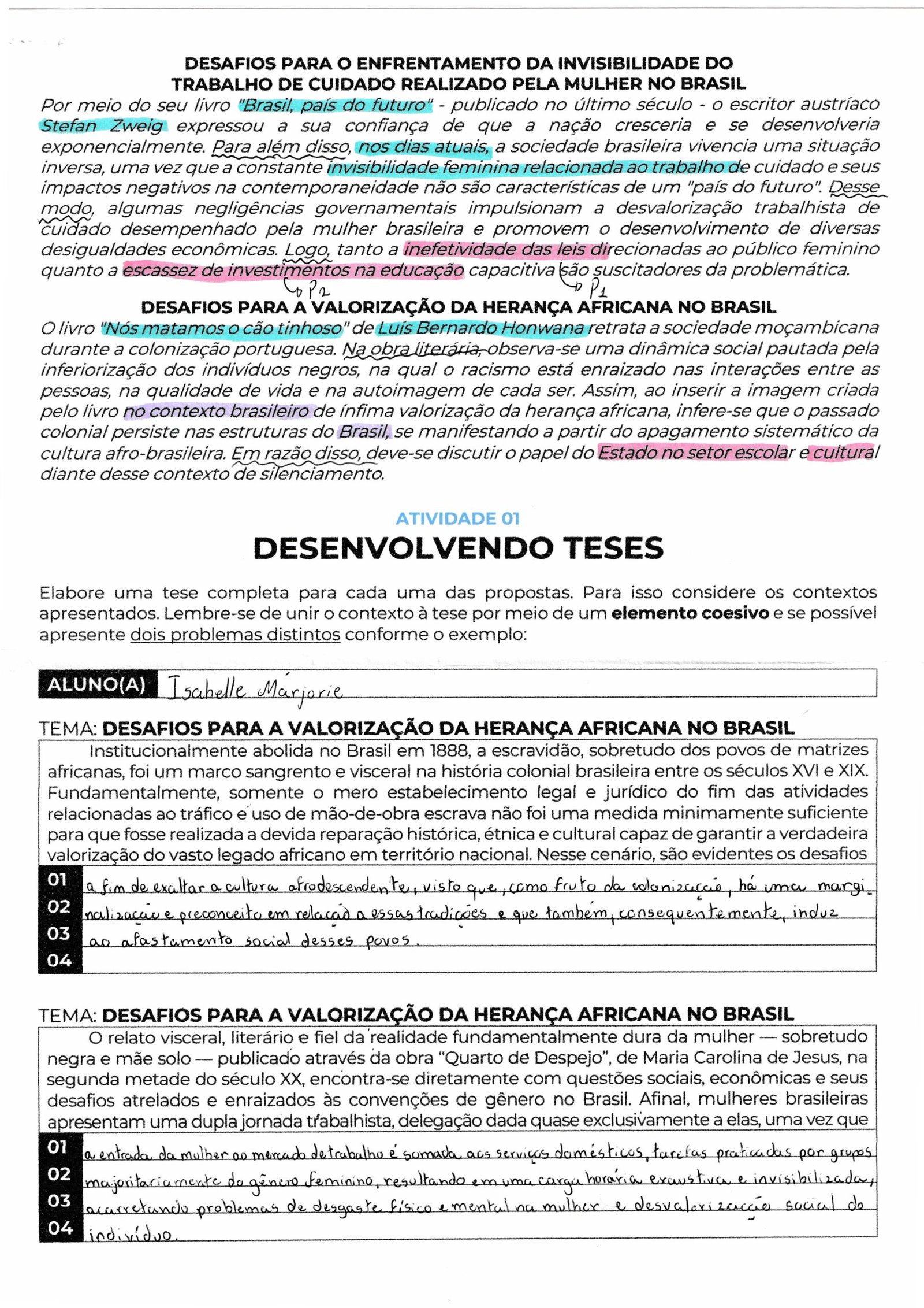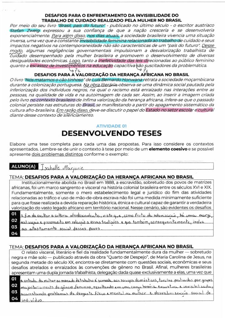 Isabelle, sua atividade demonstra boa compreensão dos temas e apresenta ideias pertinentes às problemáticas propostas. No primeiro tema, você aponta a marginalização das tradições afrodescendentes e o preconceito relacionado a essas culturas, fatores que dificultam a valorização da herança africana no Brasil. No segundo tema, sua resposta evidencia a sobrecarga feminina causada pela soma entre trabalho remunerado e tarefas domésticas, além de mencionar as consequências desse processo, como o desgaste físico e mental e a desvalorização social, o que demonstra boa percepção da realidade discutida.
