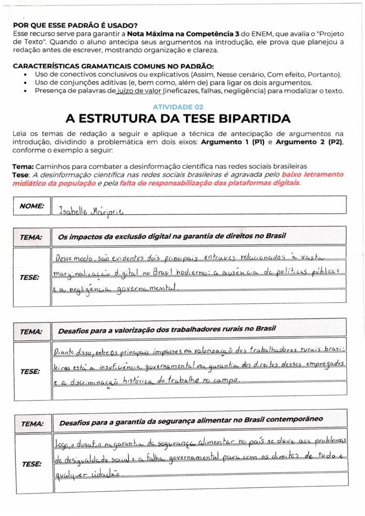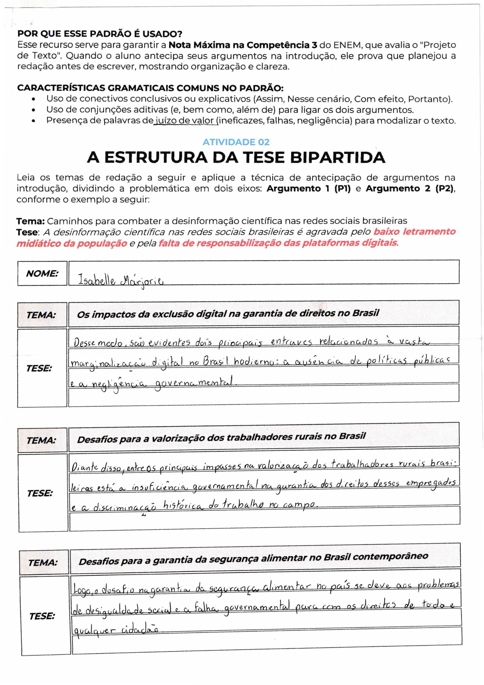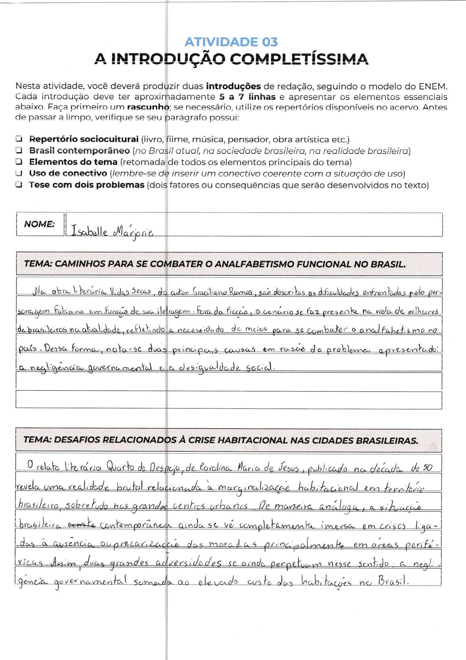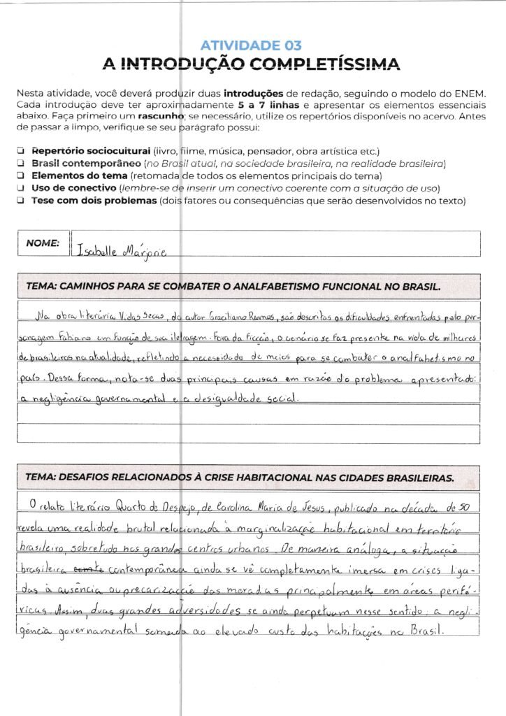 Isabelle, sua atividade demonstra boa compreensão dos temas e apresenta ideias pertinentes às problemáticas propostas. No primeiro tema, você aponta a marginalização das tradições afrodescendentes e o preconceito relacionado a essas culturas, fatores que dificultam a valorização da herança africana no Brasil. No segundo tema, sua resposta evidencia a sobrecarga feminina causada pela soma entre trabalho remunerado e tarefas domésticas, além de mencionar as consequências desse processo, como o desgaste físico e mental e a desvalorização social, o que demonstra boa percepção da realidade discutida.