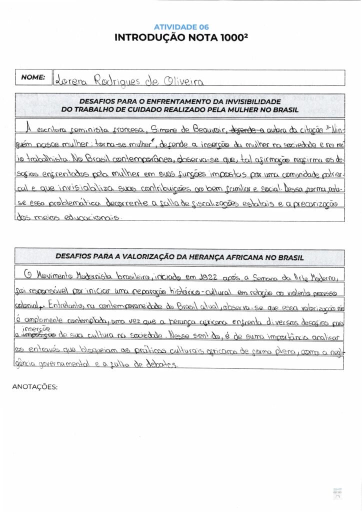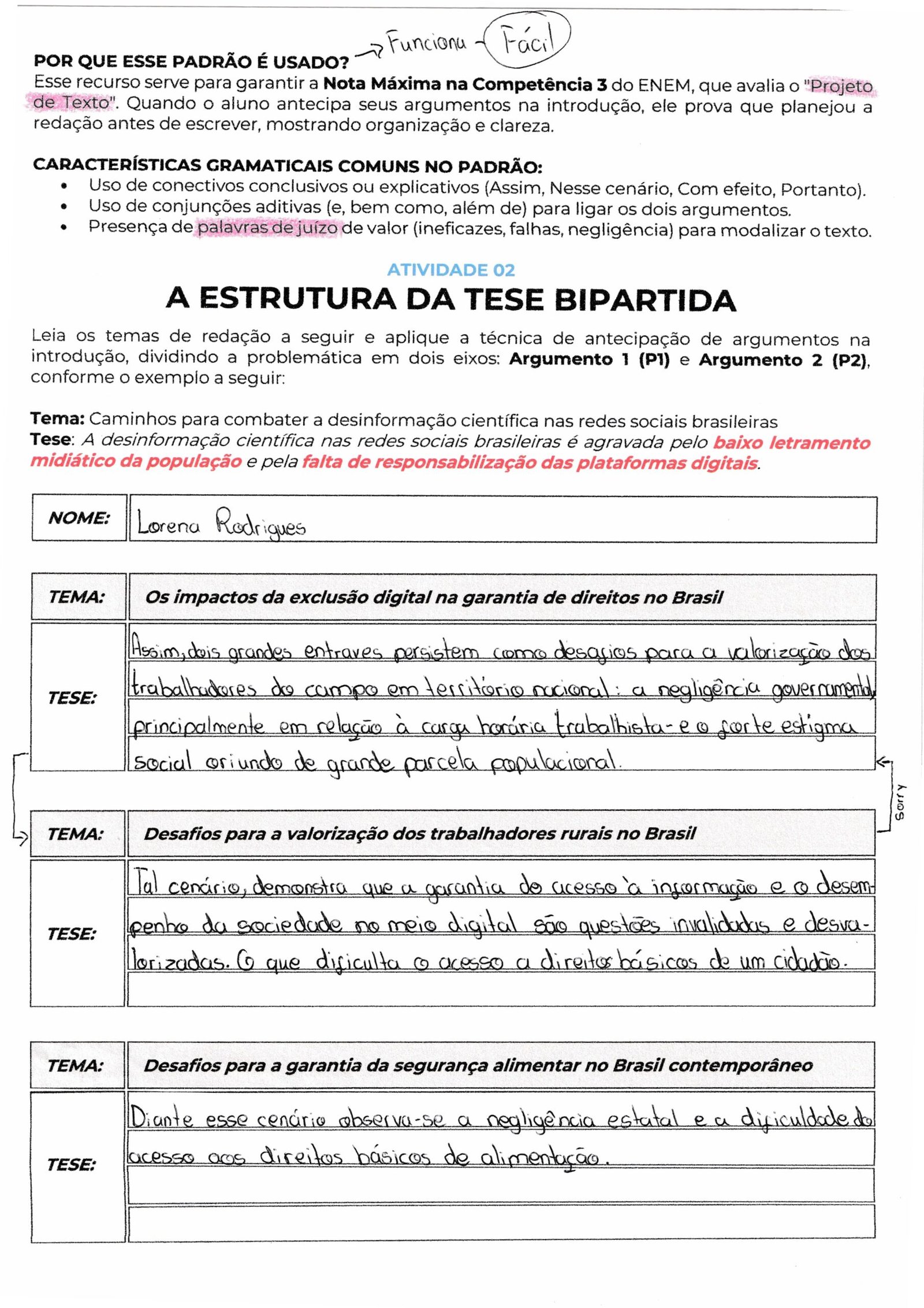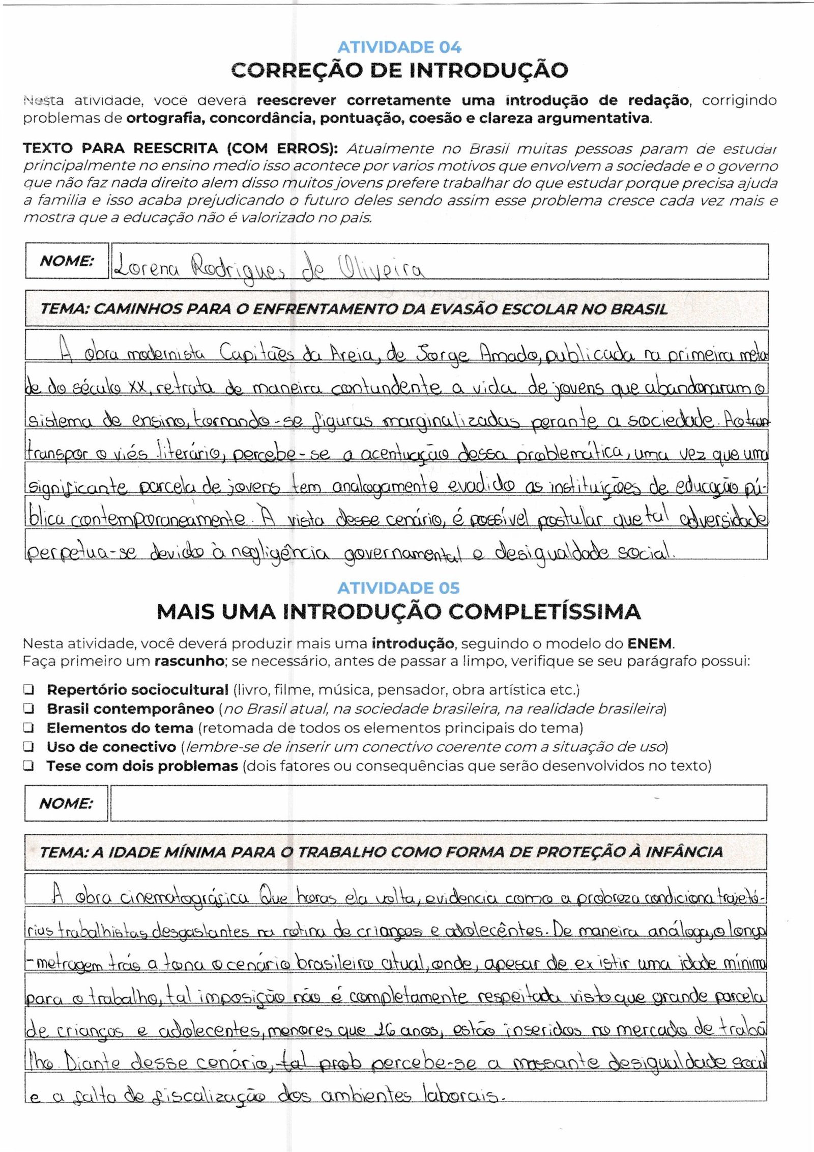 Lorena, suas introduções estão muito bem estruturadas e demonstram um domínio sólido do modelo ENEM. Você utilizou repertórios muito pertinentes, como a frase clássica de Simone de Beauvoir e o Movimento Modernista de 1922, conectando-os com precisão aos desafios da contemporaneidade. Suas teses bipartidas são claras e bem definidas, apontando problemas como a falta de fiscalizações estatais, a precarização educacional e a negligência governamental.
