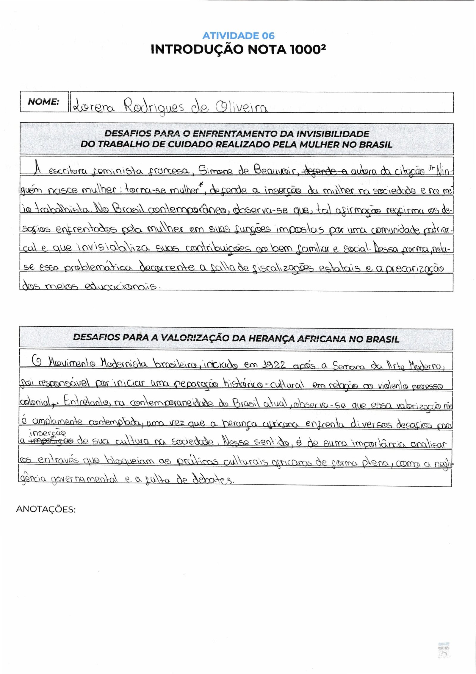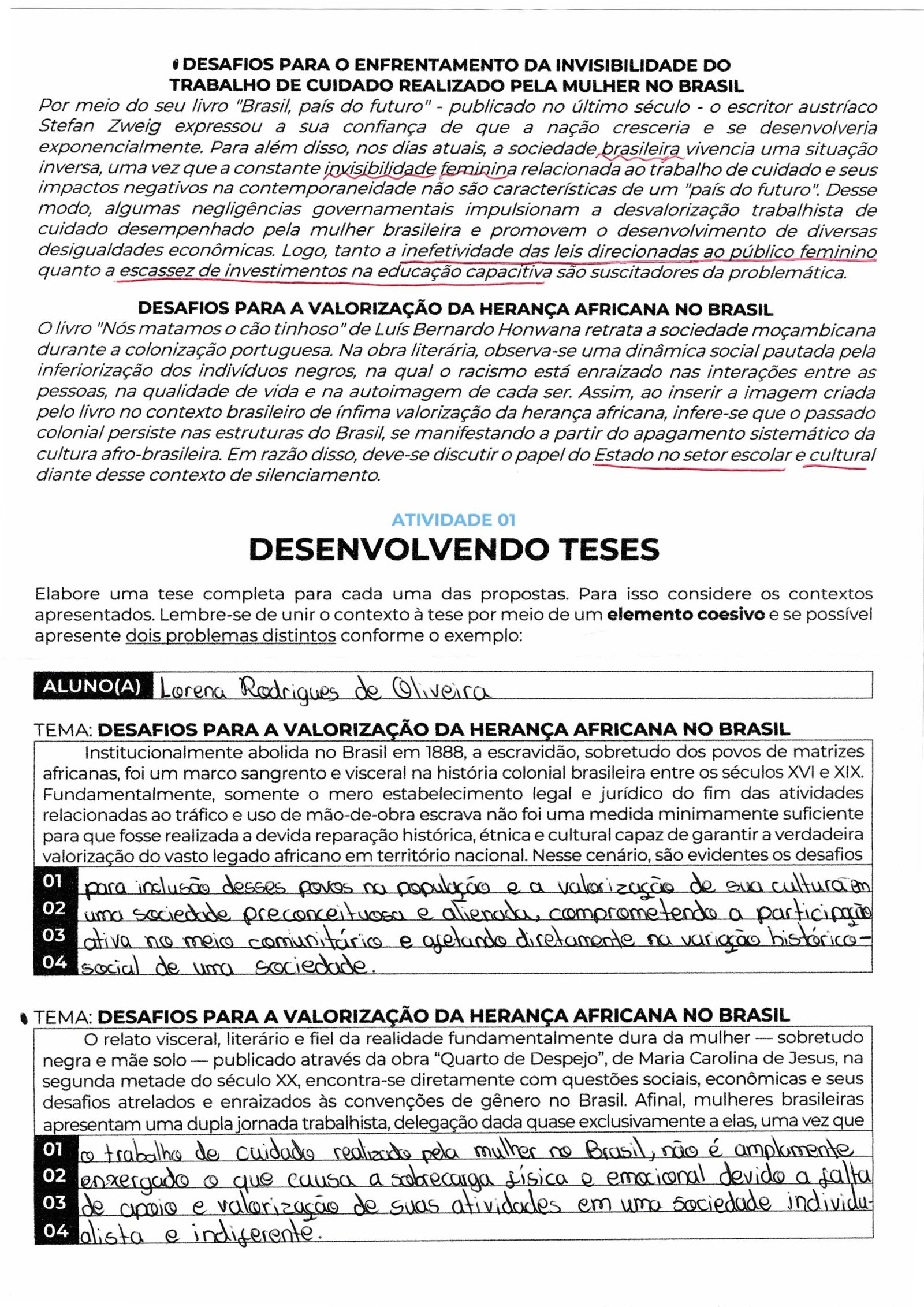 Lorena, sua atividade demonstra boa compreensão das propostas e apresenta ideias pertinentes aos dois temas. No primeiro, você aponta o preconceito social e a alienação da sociedade em relação à cultura afrodescendente, fatores que dificultam sua valorização no Brasil. No segundo, sua tese evidencia a invisibilidade do trabalho de cuidado e a falta de apoio e valorização dessas atividades, elementos que contribuem para a sobrecarga feminina. As ideias são adequadas, mas podem ser organizadas de forma mais direta para explicitar com maior clareza os dois problemas solicitados na tese.