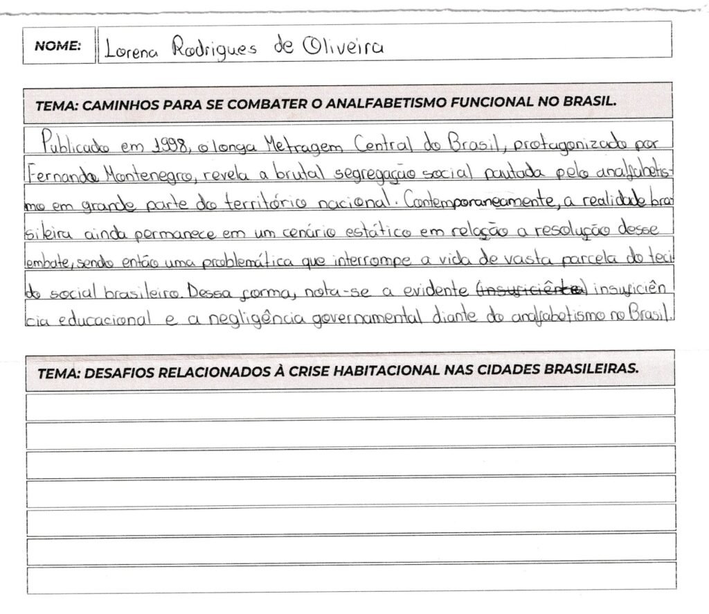 Lorena Rodrigues de Oliveira, sua introdução apresenta um excelente domínio da estrutura exigida para o ENEM ao utilizar o filme “Central do Brasil” para contextualizar a segregação social pautada pelo analfabetismo. Sua tese bipartida está claramente definida nos eixos da insuficiência educacional e da negligência governamental.