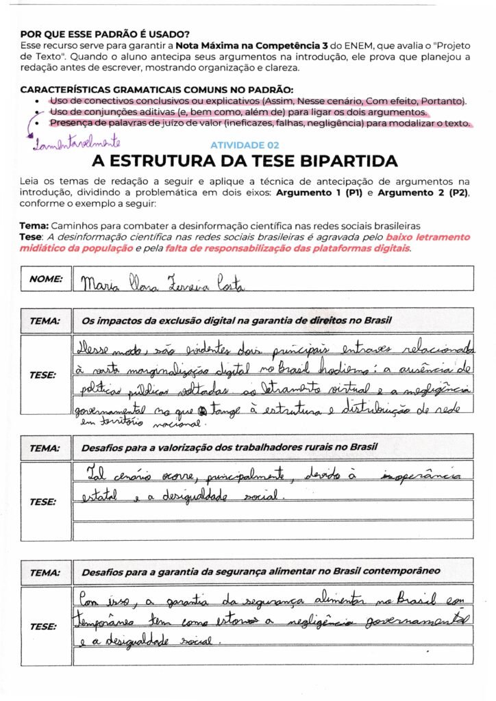 Suas teses bipartidas estão claras e bem definidas, apontando problemas como a negligência governamental, a falta de investimentos na educação e a fragilidade legislativa. Isso garante um ótimo projeto de texto para os parágrafos de desenvolvimento.