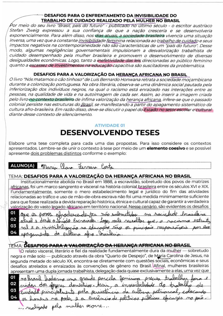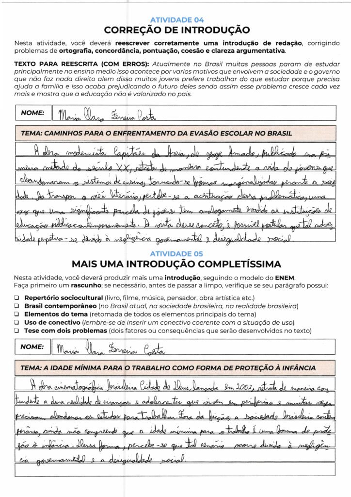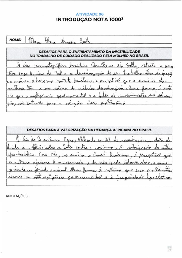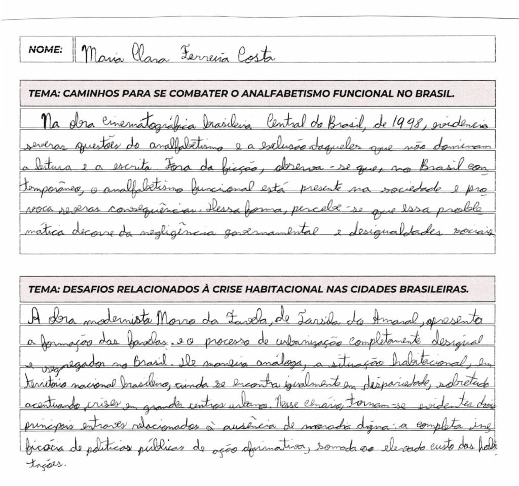 Maria Clara, suas introduções estão muito bem organizadas e demonstram um domínio sólido da estrutura exigida para uma nota alta. Você utilizou repertórios pertinentes, como o filme “Que Horas Ela Volta?” e a importância do Dia da Consciência Negra, conectando-os de forma fluida ao contexto brasileiro atual através de bons conectivos, como “Fora da ficção” e “Nesse viés“.