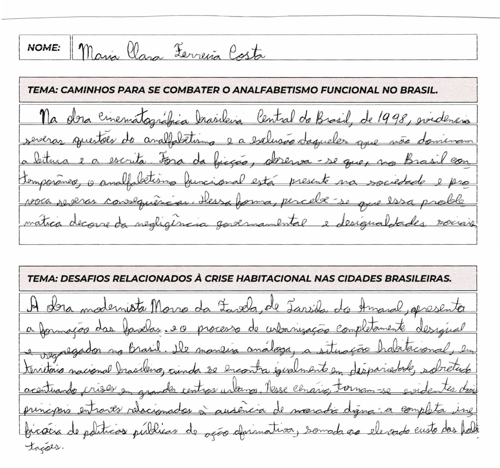 Caligrafia: Sua letra é muito boa e legível, mas cuidado com rasuras leves; tente manter a folha o mais limpa possível.