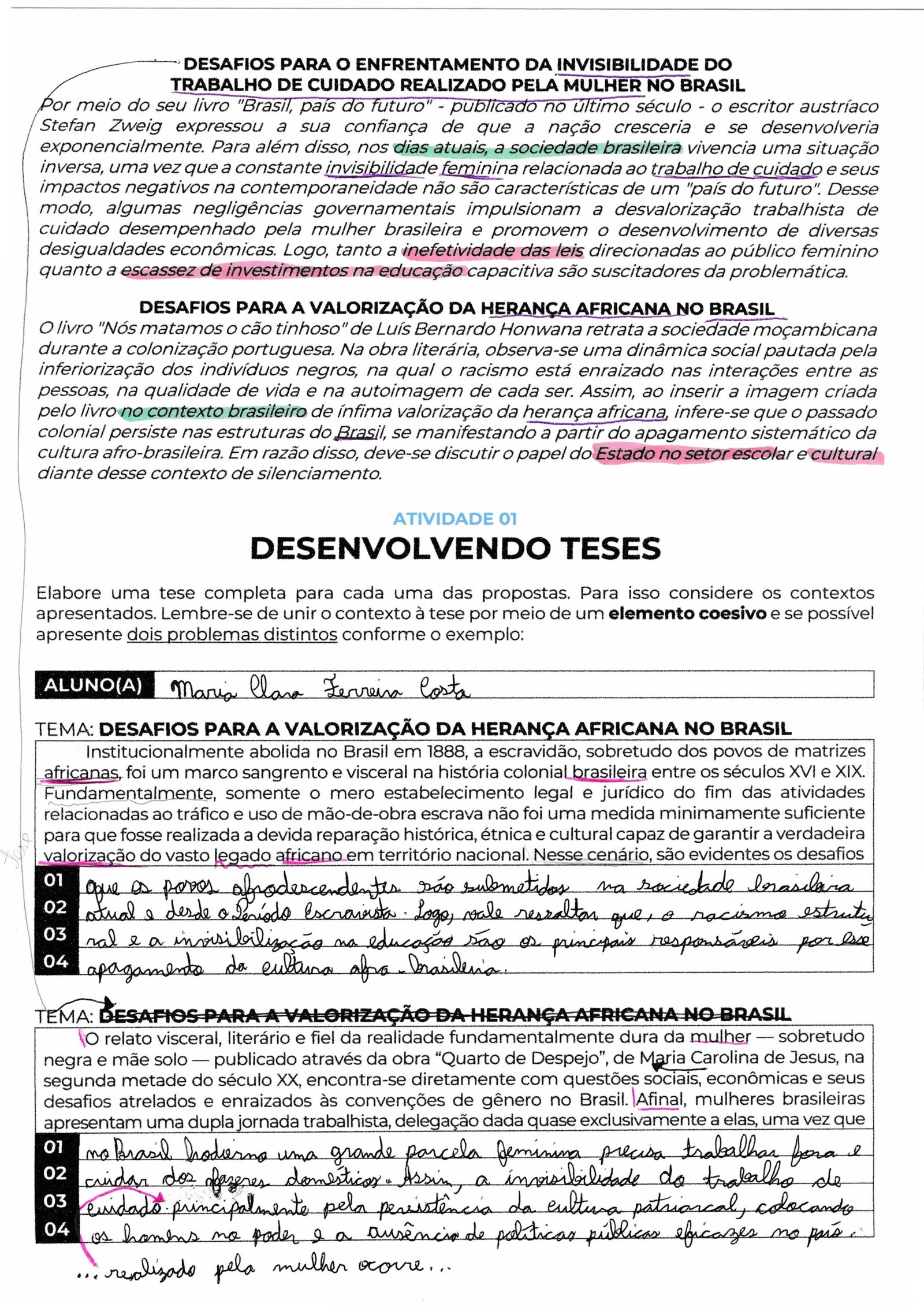 Acentuação e Concordância: No primeiro texto, você usou corretamente o acento circunflexo em “têm” (plural de mulheres), o que é excelente. No entanto, cuidado com a grafia de palavras como “notório” e “problemática” para que fiquem sempre bem legíveis.