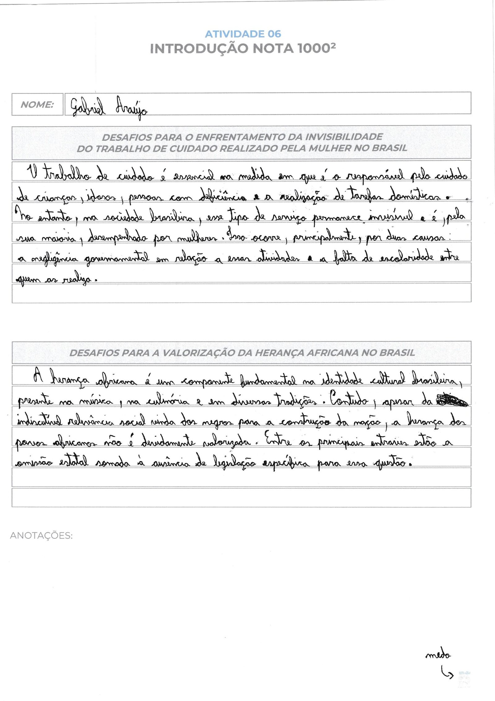 Contudo, para atingir a “Nota 1000”, falta um elemento obrigatório no início dos parágrafos: o repertório sociocultural. Atualmente, você inicia seus textos com definições ou afirmações do senso comum (“O trabalho de cuidado é essencial…”, “A herança africana é um componente fundamental…”). O ENEM exige que você “legitime” sua fala logo na abertura, utilizando um livro, filme, fato histórico, música ou conceito filosófico para dar base ao seu argumento.