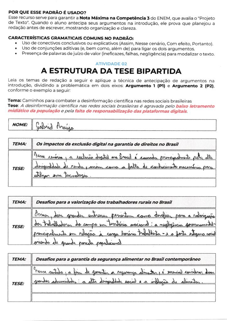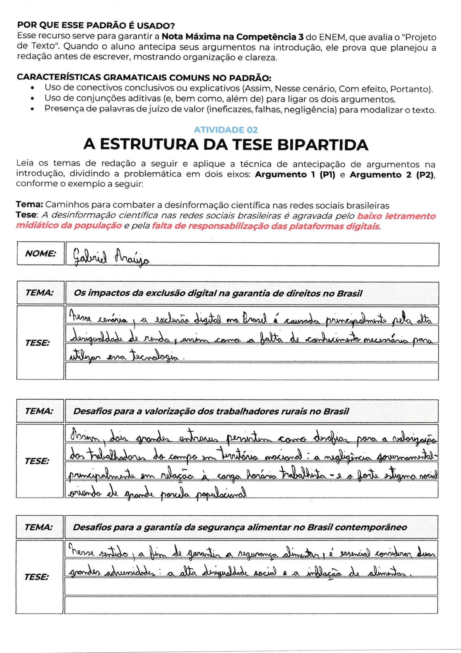 Gabriel, suas introduções apresentam uma excelente clareza argumentativa. Quero destacar que suas teses bipartidas estão muito boas: você identifica com precisão os dois problemas centrais (como a negligência governamental e a falta de escolaridade no primeiro tema, e a omissão estatal somada à ausência de legislação no segundo). Esse direcionamento é o coração de um bom projeto de texto.