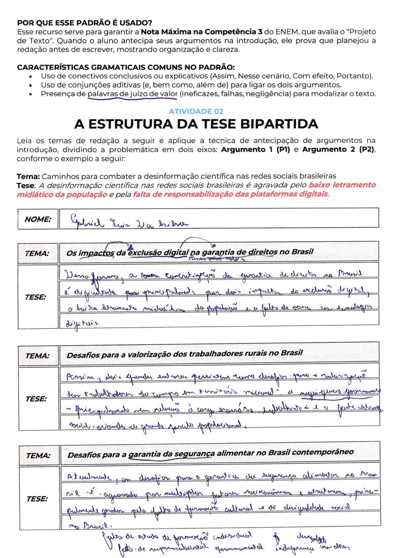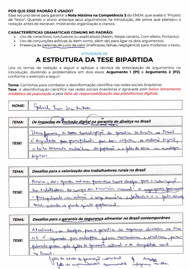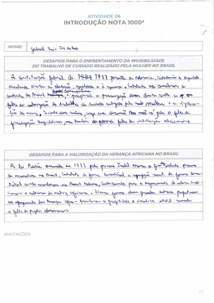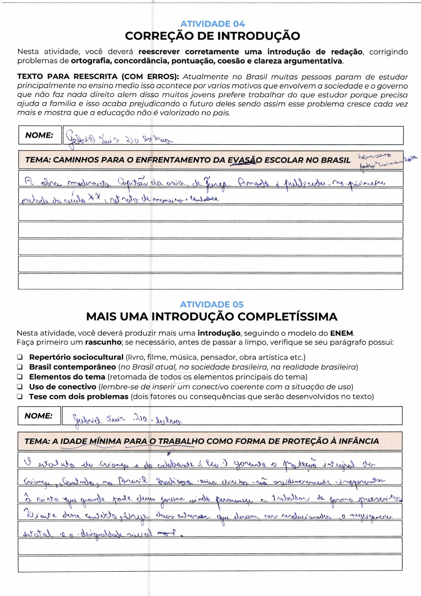 Gabriel Luiz, suas introduções estão muito bem fundamentadas e seguem a estrutura exigida pelo ENEM. Você utilizou repertórios pertinentes, como a Constituição Federal de 1988 e a Lei Áurea, para contextualizar os temas e conseguiu fechar ambos os parágrafos com teses bipartidas claras, focando em problemas como a falta de fiscalização legislativa, a falha das instituições educacionais e a fragilidade do incentivo estatal.