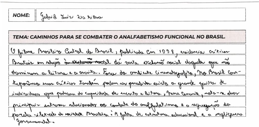 No entanto, preciso te fazer um alerta muito importante sobre a sua caligrafia. Em vários momentos do texto, as letras e palavras estão muito juntas e “emboladas”, o que dificulta a leitura fluida. Lembre-se de que o corretor do ENEM tem centenas de redações para ler e, se ele encontrar dificuldade em decifrar o que você escreveu (como ocorreu em palavras como “contemporâneo”, “fiscalização” ou “instituições”), isso pode prejudicar sua nota na Competência 1 e até na compreensão do seu argumento. Tente dar um pouco mais de espaçamento entre as palavras e definir melhor o traçado das letras.