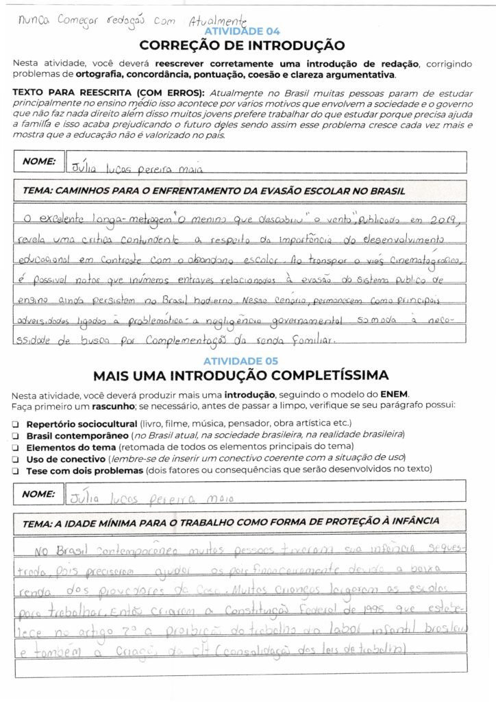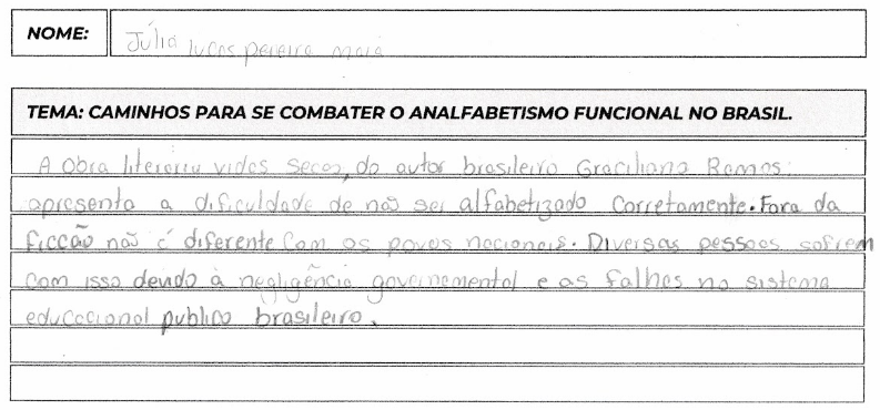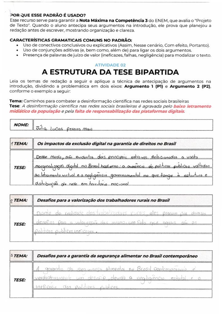 A estrutura gramatical está correta, mas notei que suas teses ficaram um pouco curtas e com apenas um eixo central bem definido. Na tese 2, você mencionou apenas as “políticas públicas ineficazes” e, na tese 3, repetiu esse argumento junto com a “negligência estatal“, que são conceitos muito semelhantes. Para uma nota maior na Competência 3, é fundamental apresentar dois eixos causais distintos. Além disso, recomendo fazer as próximas atividades à tinta, pois o lápis dificulta a leitura e a correção profissional.