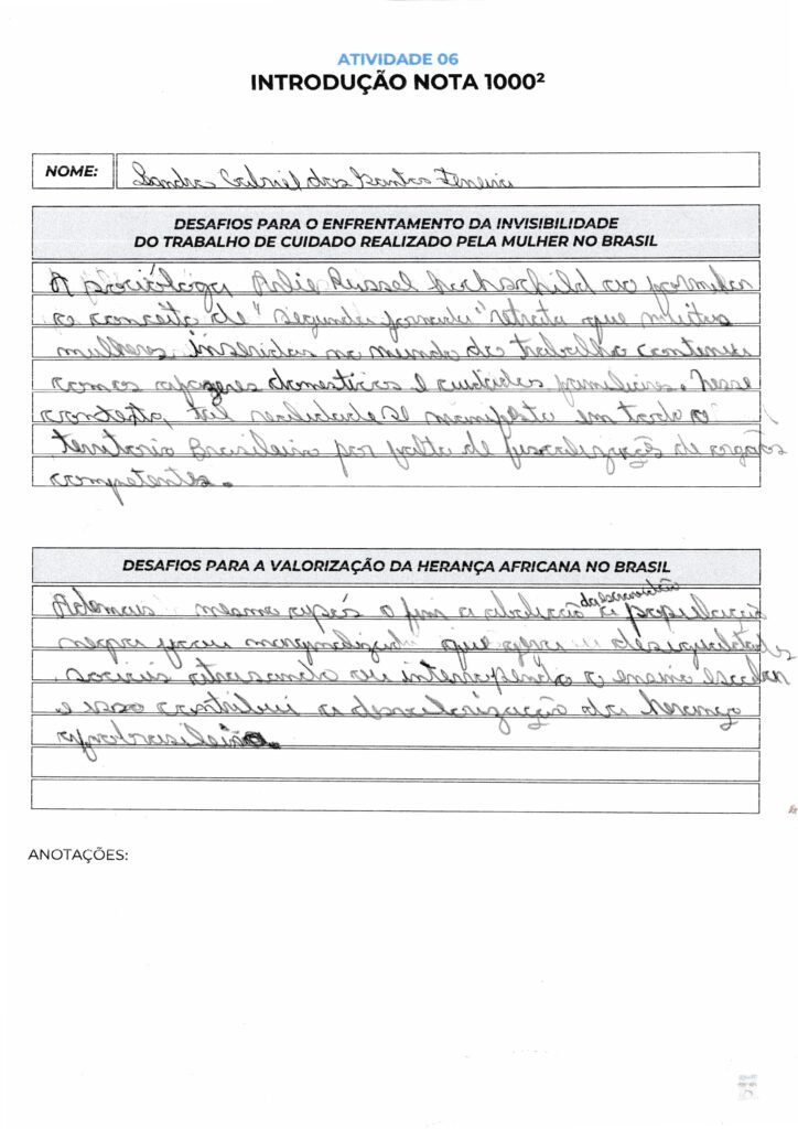 Além disso, você precisa ter muito cuidado com a acentuação gráfica e a ortografia. Palavras como “está”, “país” e “história” precisam de acento, e nomes próprios ou de instituições devem começar com letra maiúscula. Sua caligrafia também precisa de mais clareza e capricho; letras ilegíveis ou muito “emboladas” podem fazer com que o corretor desconsidere trechos inteiros do seu argumento na Competência 1.