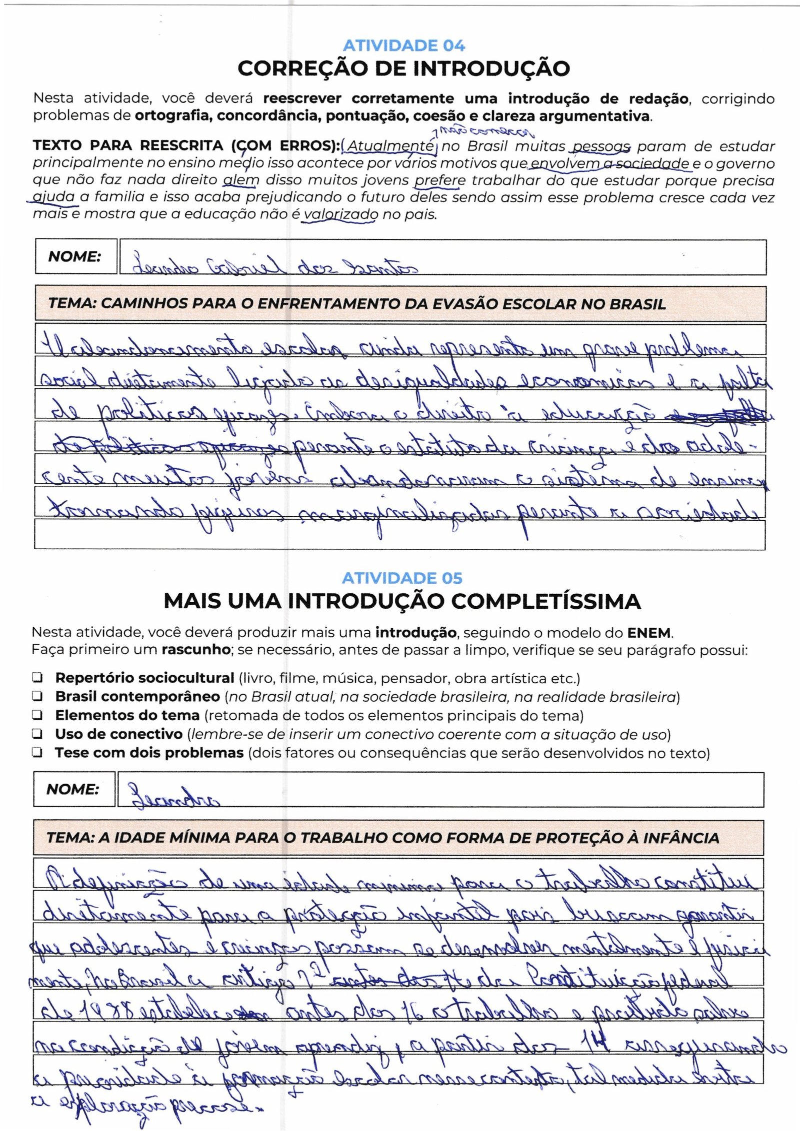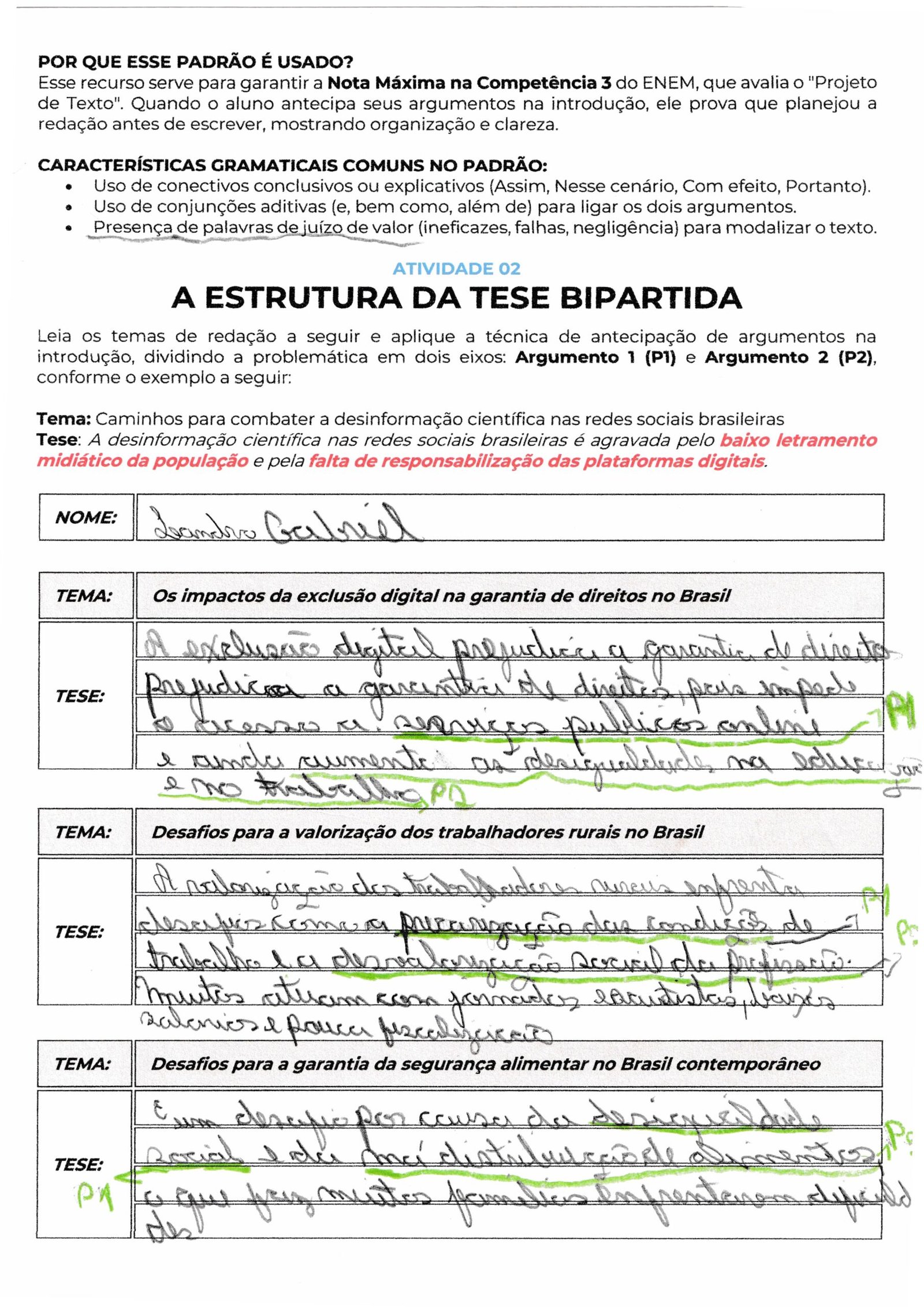 Observe que o modelo começa com um fato histórico (repertório), conecta com o tema atual e termina apontando dois problemas claros que serão discutidos no desenvolvimento. Aplique essa estrutura nas próximas vezes e foque na clareza da sua letra.