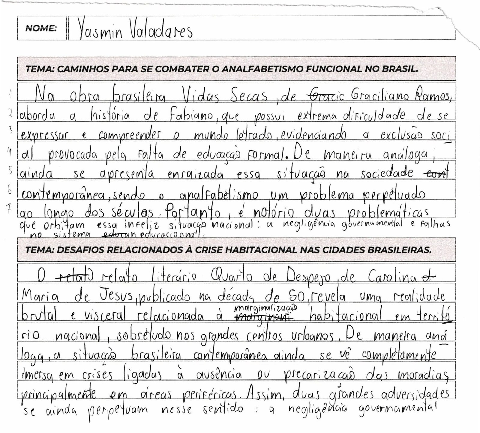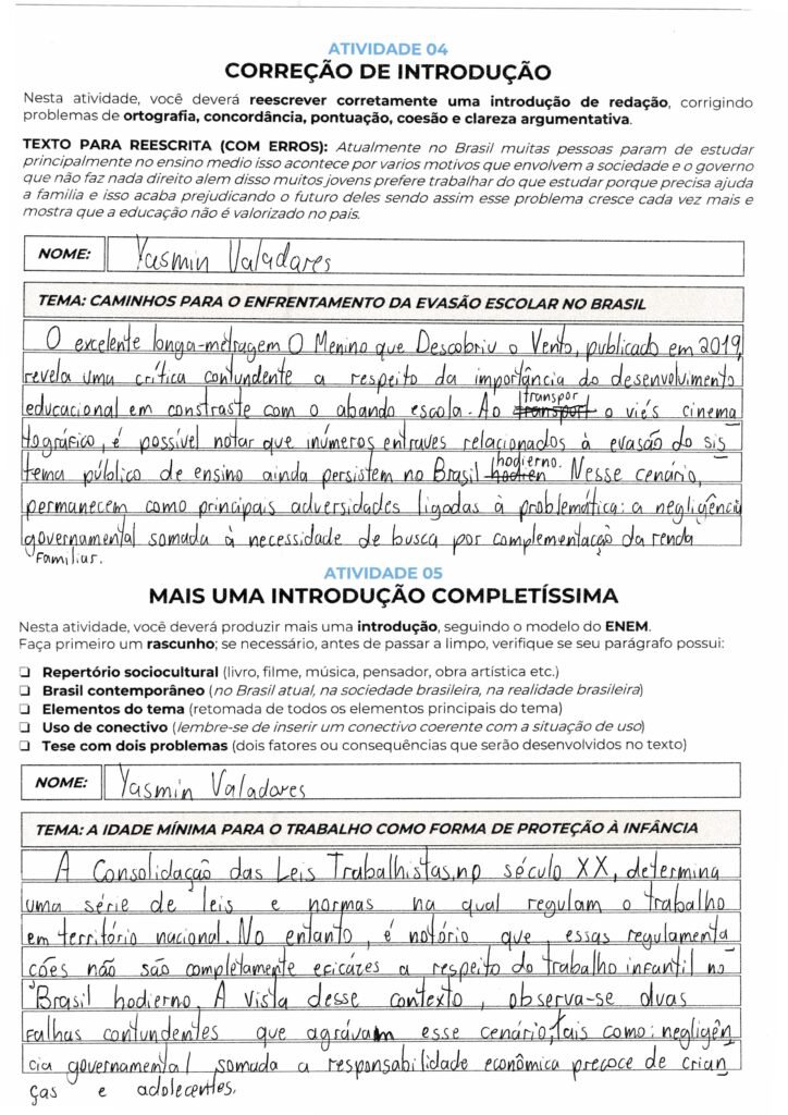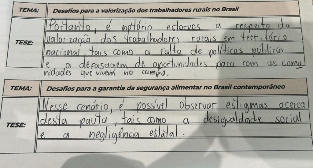 A estrutura gramatical está muito boa, e você utiliza conectivos de forma sofisticada para introduzir seus argumentos. No entanto, na primeira tese, a frase ficou um pouco fragmentada visualmente devido à distribuição nas linhas, o que pode prejudicar a fluidez da leitura. Na segunda tese, você incluiu muitos elementos explicativos e marcas de exemplificação dentro da própria tese (como a questão dos cargos elevados). Lembre-se: na técnica bipartida, o objetivo é apresentar os dois eixos causais de forma direta e concisa, reservando o detalhamento e os exemplos para os parágrafos de desenvolvimento.