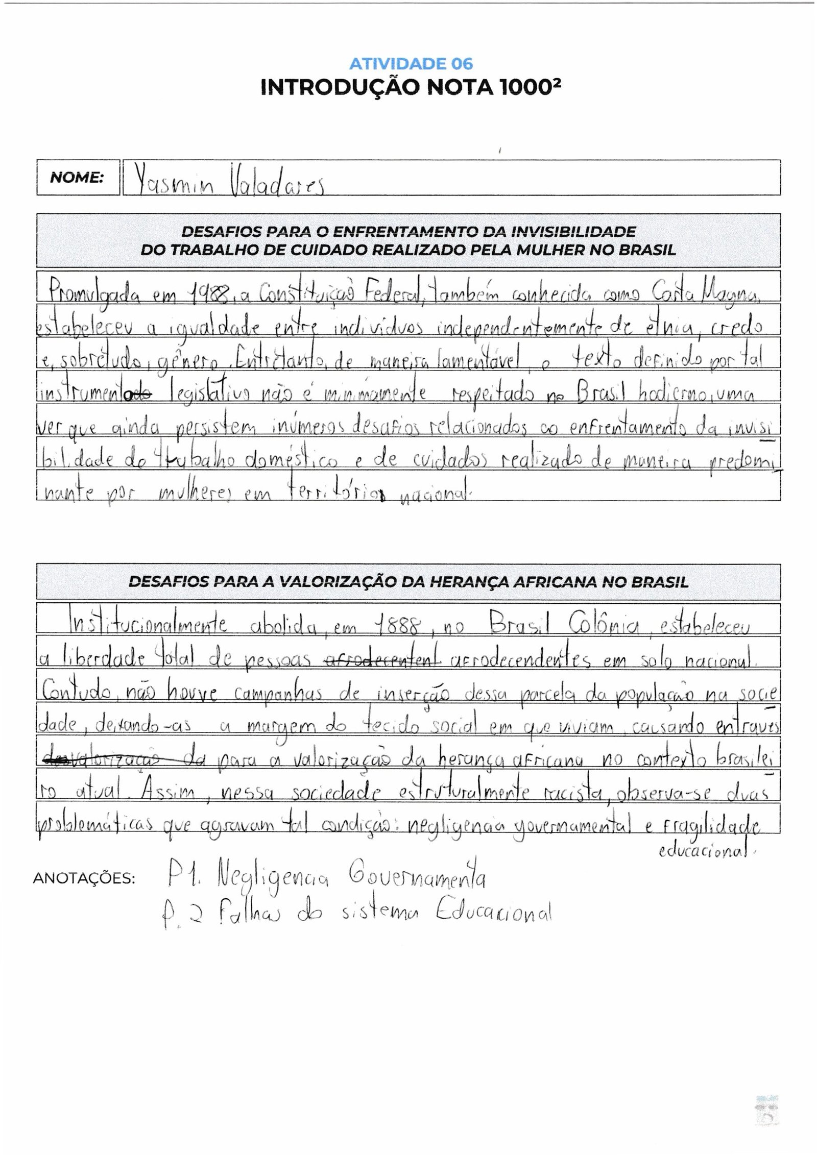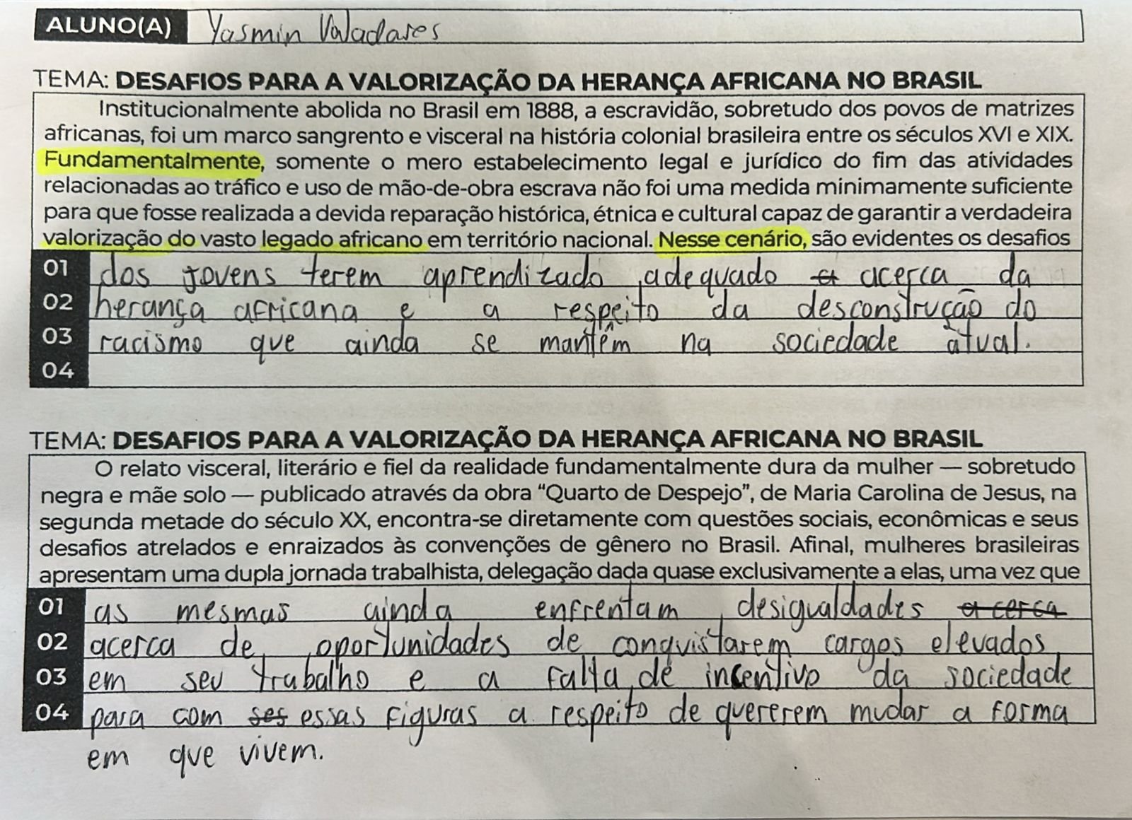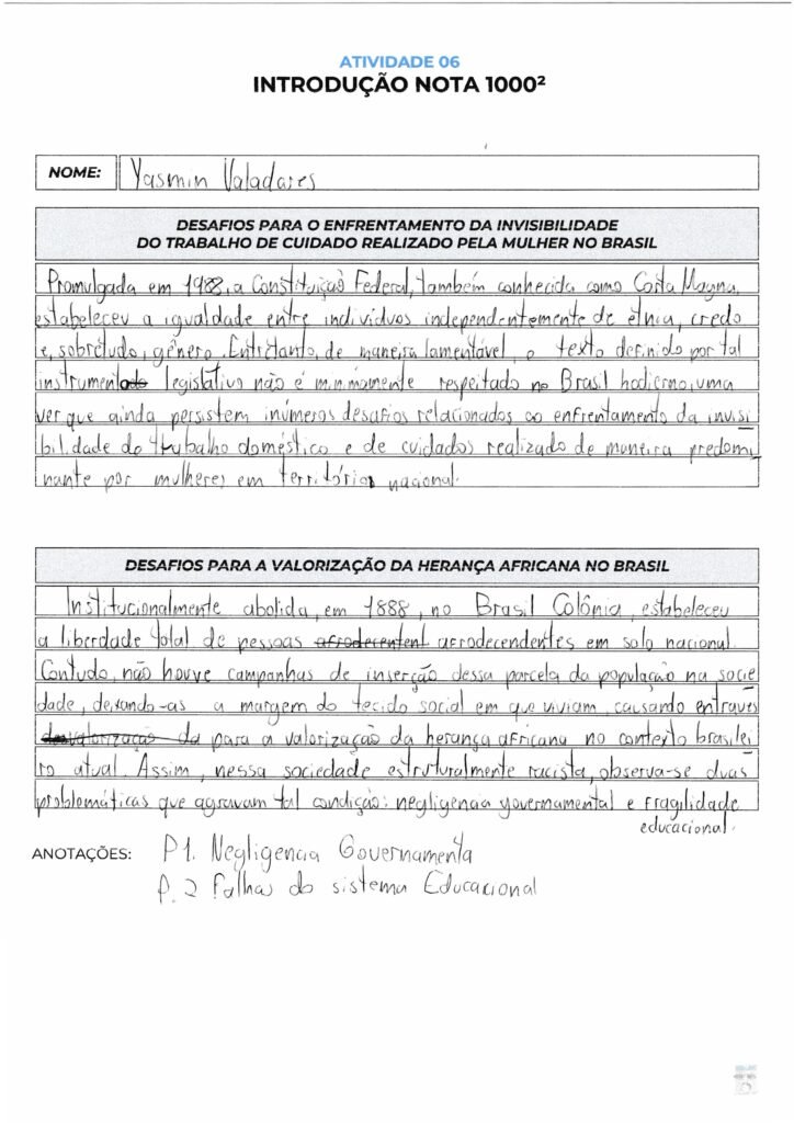 Tese 1: “Nesse cenário, são evidentes dois desafios: o aprendizado inadequado sobre a herança africana e a necessidade de desconstrução do racismo estrutural.”