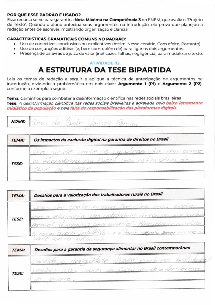 Minha orientação é que você reorganize as ideias em um bloco único, utilizando conectivos e separando os elementos fundamentais: repertório, fomento e tese bipartida. Evite expressões subjetivas como “por não se importar” ou “não se esforçar”, preferindo termos técnicos como “omissão estatal” ou “insuficiência de políticas públicas”.