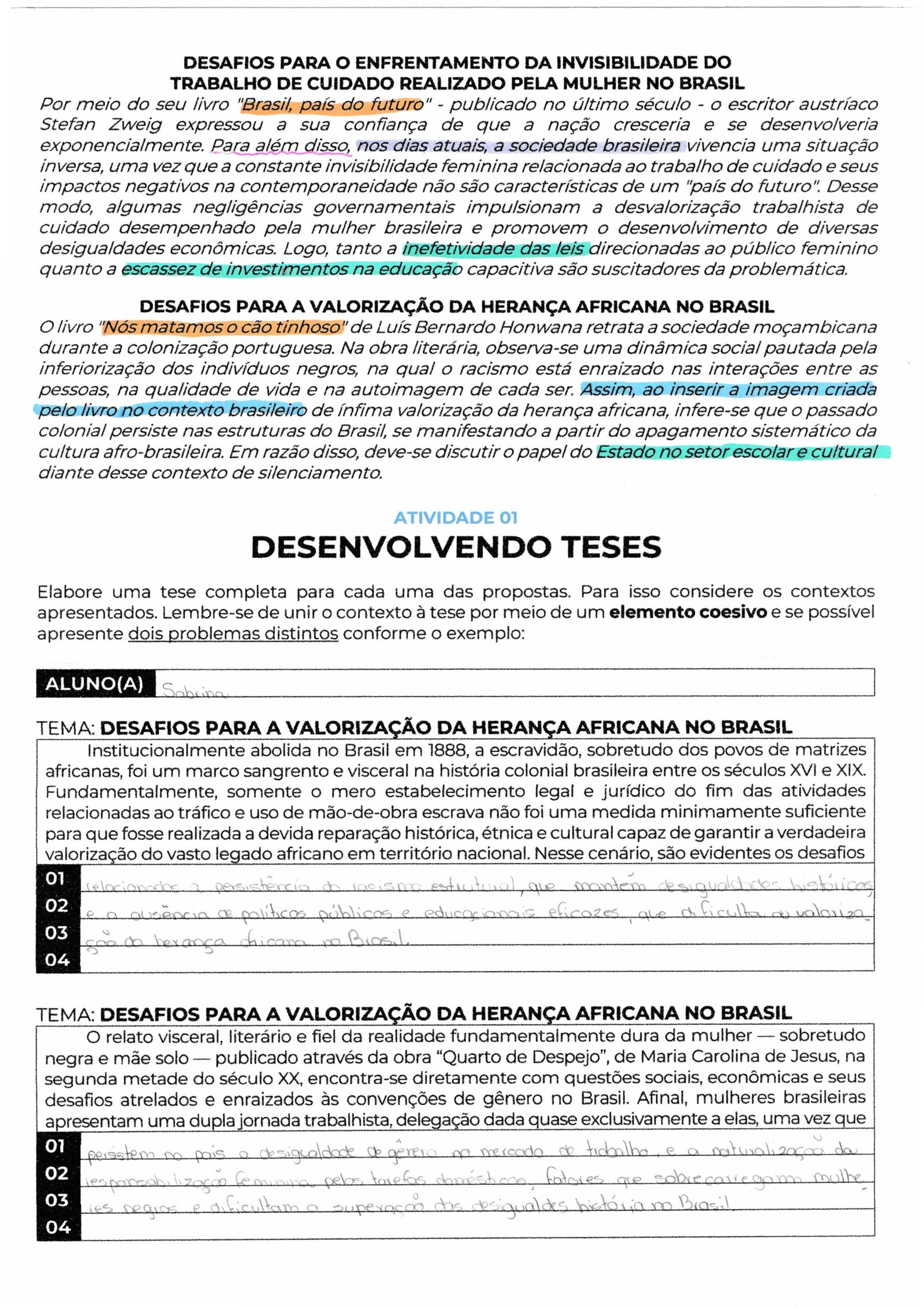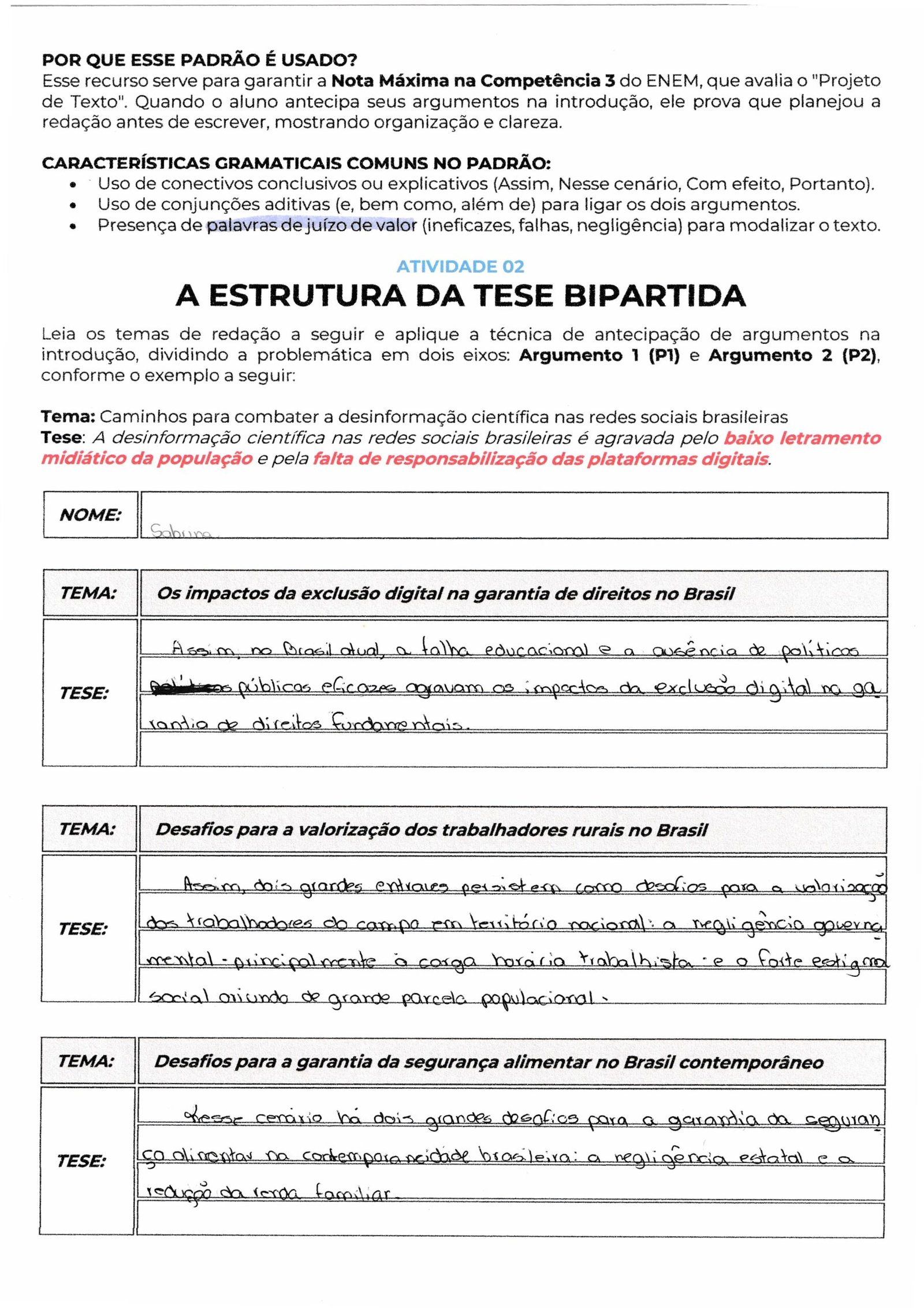 Na estrutura da tese, prefira sempre a construção direta para garantir clareza ao corretor, como em nota-se dois grandes problemas: a inoperância estatal e a profunda disparidade socioeconômica brasileira. O parágrafo cumpre os requisitos do modelo ENEM, apresentando conectivos adequados como Entretanto e À vista desse cenário, além do recorte para a realidade brasileira atual.