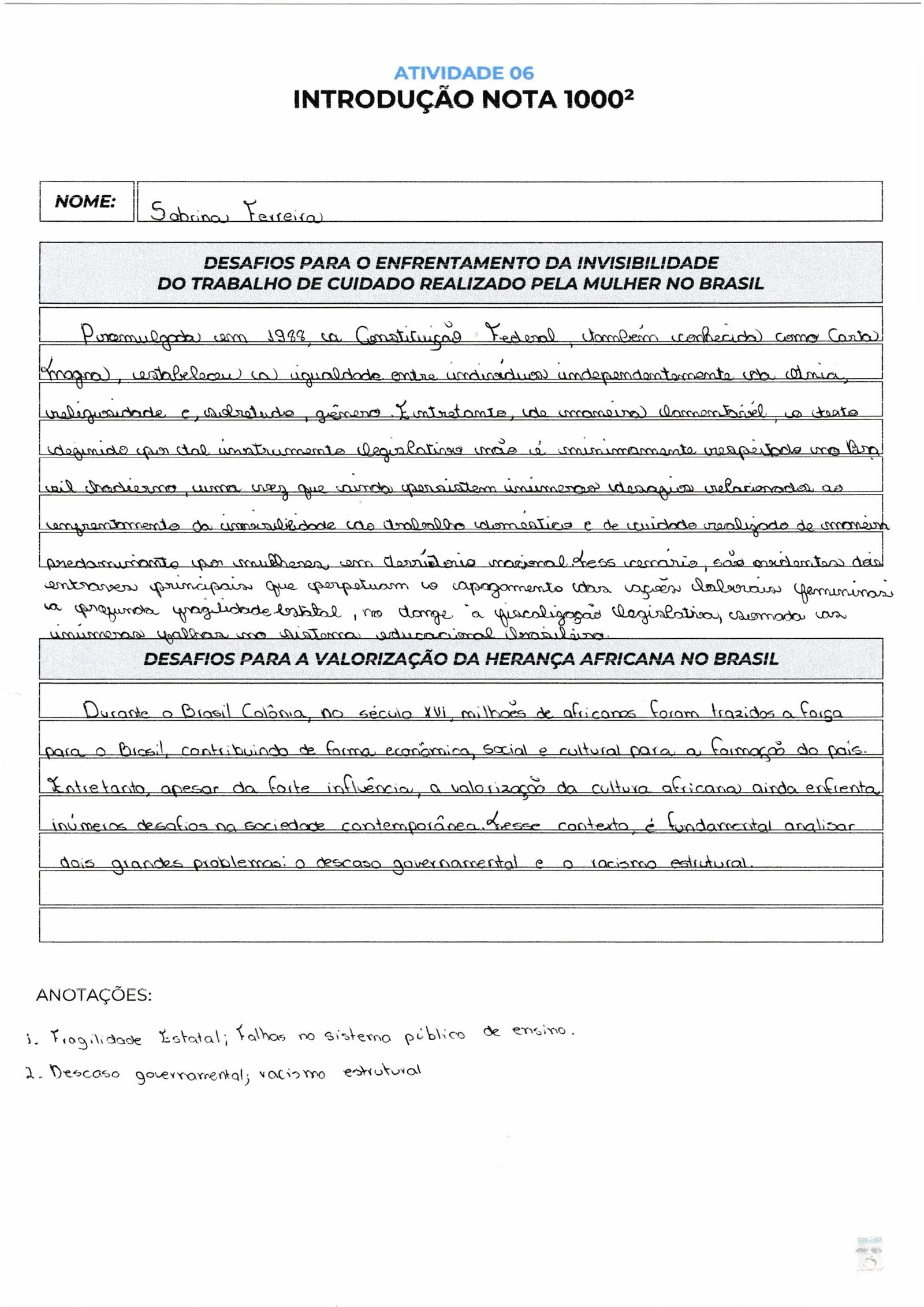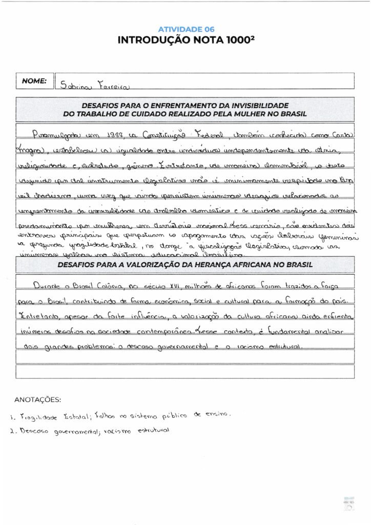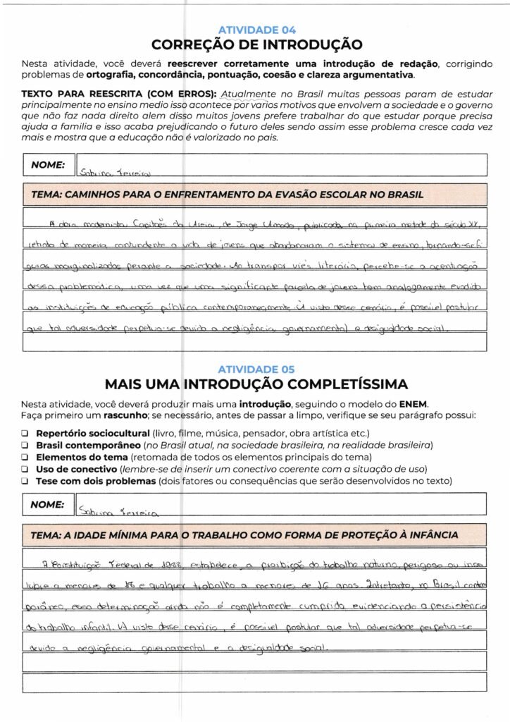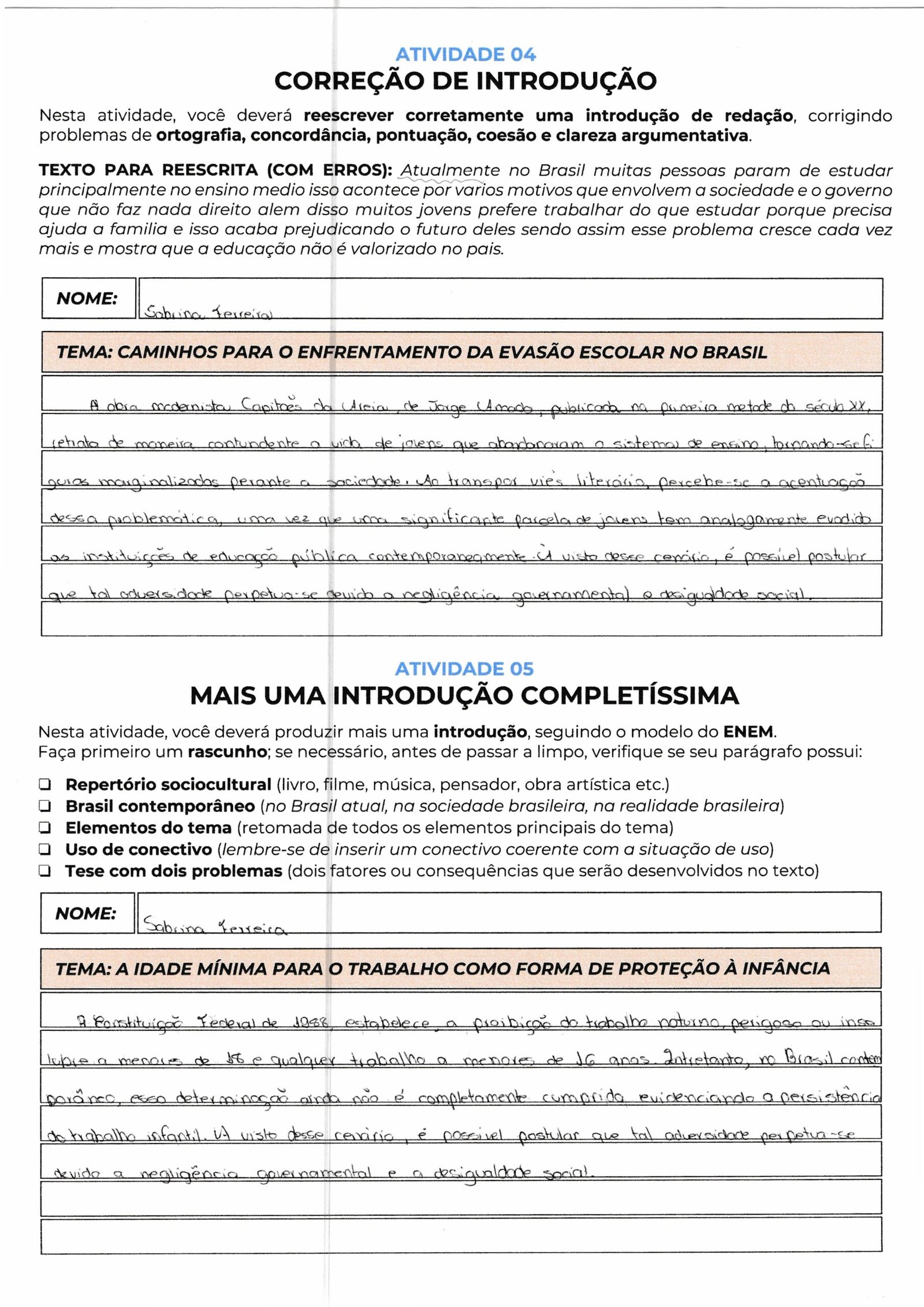 Sabrina, sua introdução utiliza de forma produtiva a Constituição Federal de 1988 para contextualizar as restrições legais ao trabalho de menores, demonstrando um bom uso de repertório legitimado e pertinente ao tema. Sua tese bipartida está bem construída nos eixos da negligência governamental e da desigualdade social, o que estabelece um projeto de texto sólido para o desenvolvimento.
