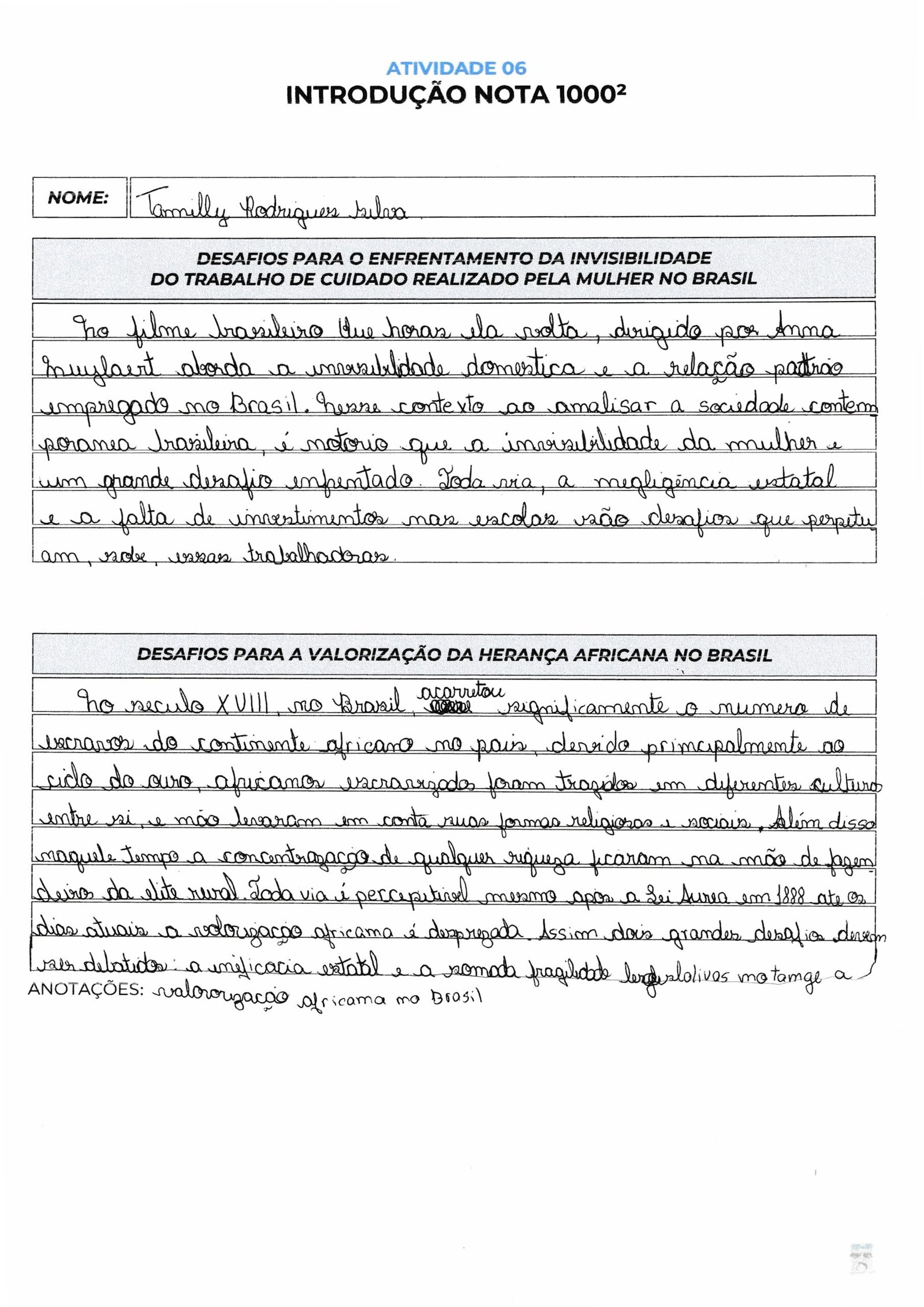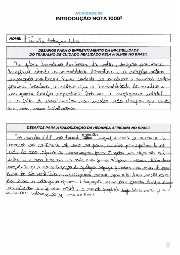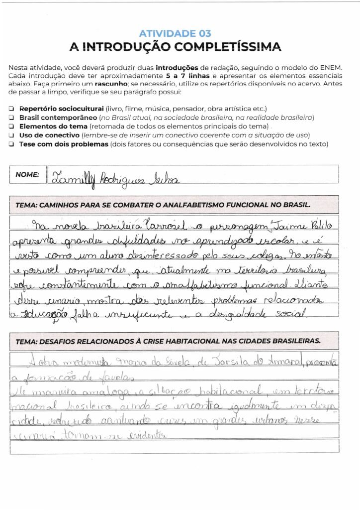 Tamilly, sua introdução utiliza a novela “Carrossel” para contextualizar o tema, o que é um repertório pertinente, porém considerado de baixa complexidade para o nível exigido no ENEM. Para garantir uma pontuação mais alta na Competência 2, o ideal é utilizar repertórios “legitimados” (conceitos sociológicos, fatos históricos ou obras literárias clássicas).