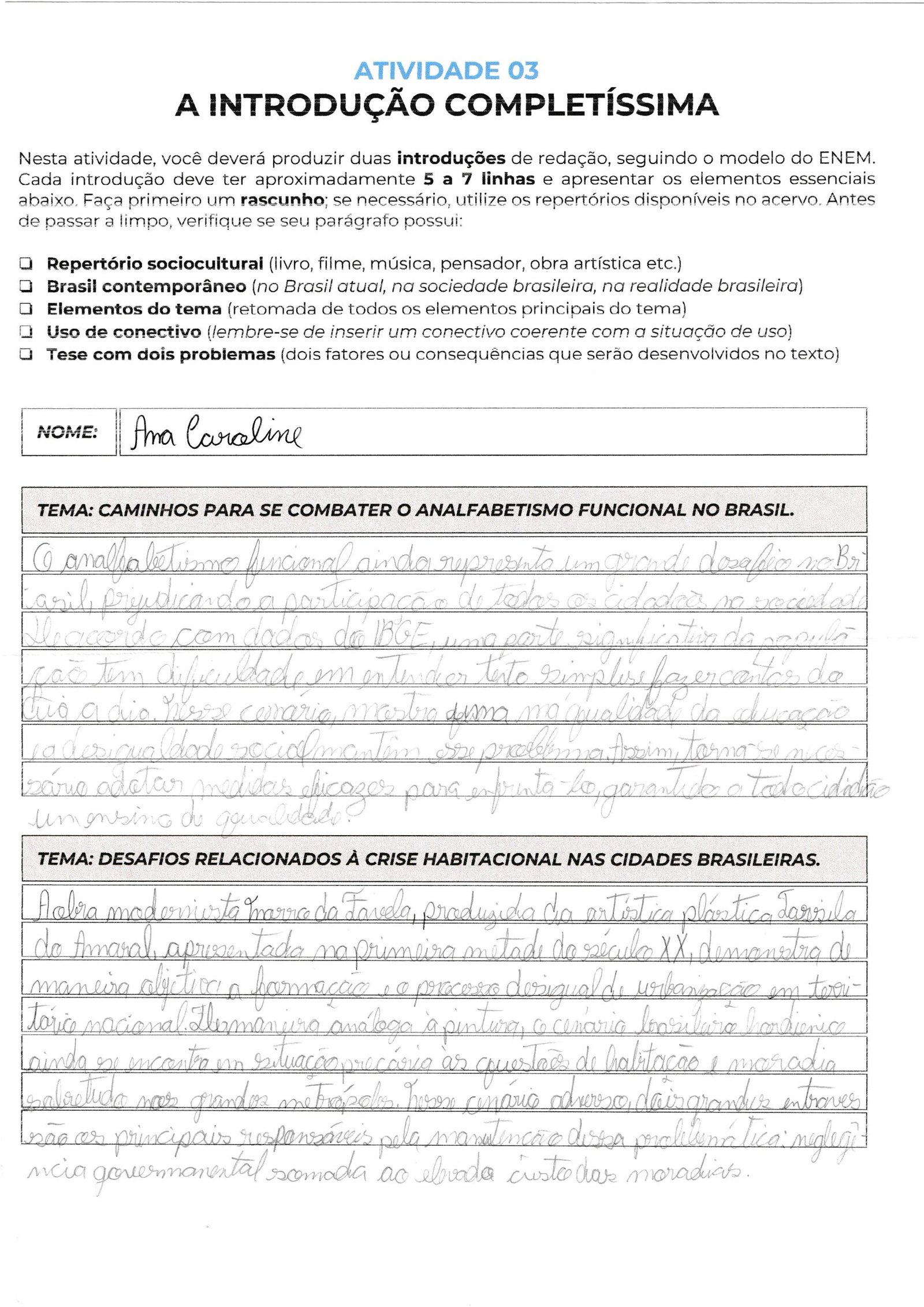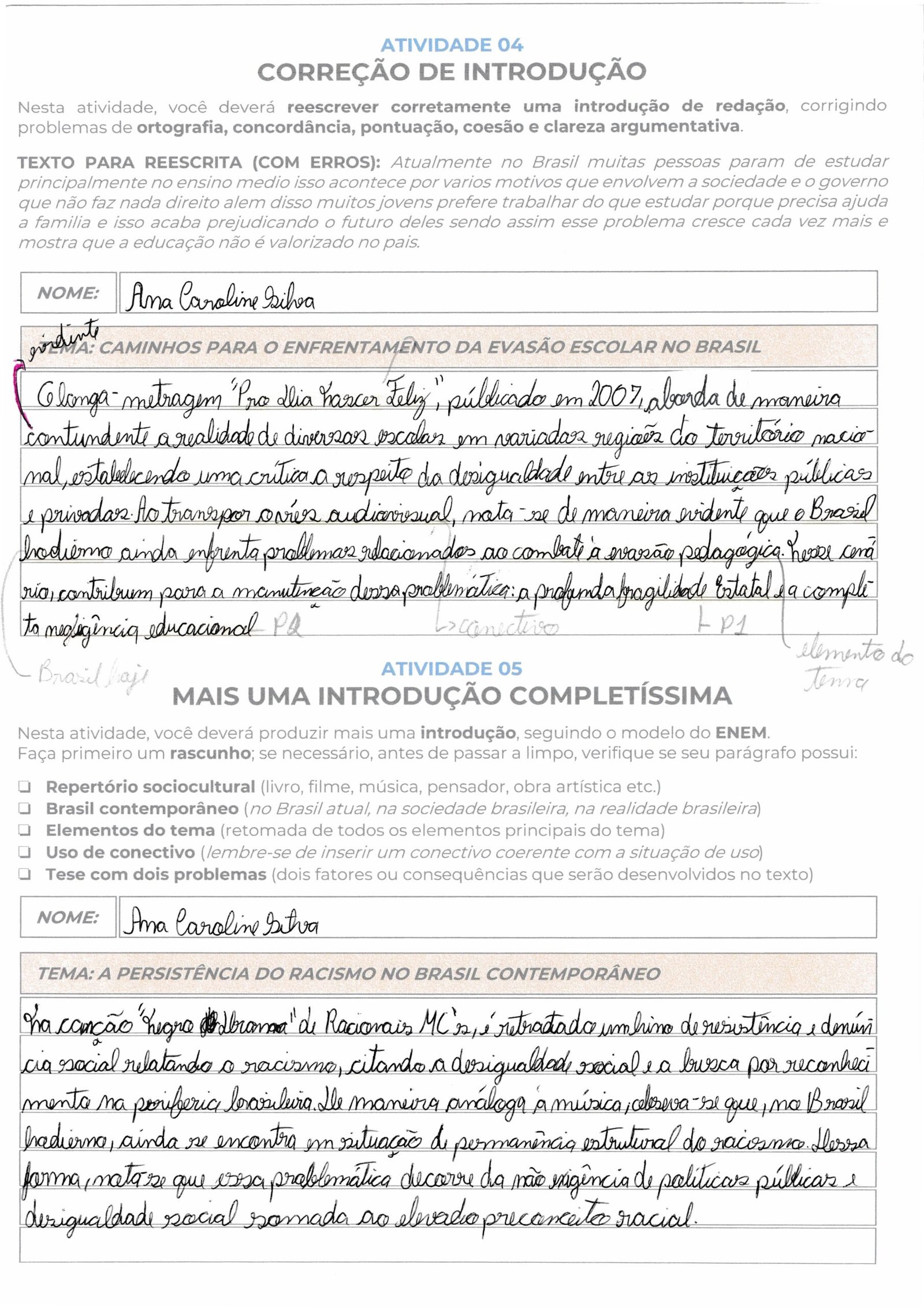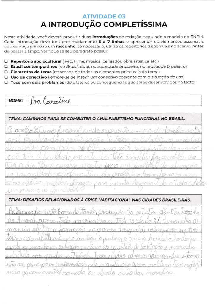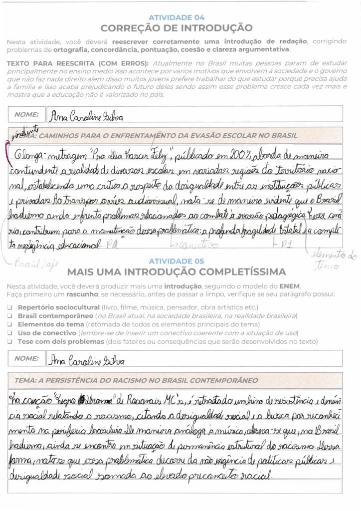 Ana, sua introdução demonstra um excelente entendimento da estrutura exigida pelo ENEM, especialmente na escolha do repertório sociocultural. Utilizar a canção “Negro Drama”, dos Racionais MC’s, como um hino de resistência e denúncia, confere muita força e legitimidade à sua argumentação na Competência 2, pois estabelece uma conexão direta entre a arte e a realidade social das periferias brasileiras. Sua tese bipartida está bem localizada ao final do parágrafo, apontando a insuficiência de políticas públicas e o elevado preconceito racial como as causas centrais a serem discutidas nos seus próximos parágrafos de desenvolvimento.