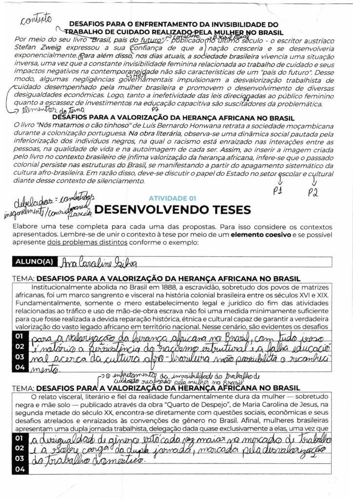 Em relação ao vocabulário, a expressão “não exigência de políticas públicas” pode ser substituída por termos mais técnicos e precisos, como “negligência estatal na implementação de ações afirmativas” ou “lacuna nas políticas públicas de inclusão”. O uso de conectivos como “De maneira análoga” e “Dessa forma” foi muito feliz e garante uma boa progressão textual na Competência 4. Sua caligrafia é legível e organizada, o que facilita a correção, mas manter a atenção constante na revisão final dos acentos fará com que você não perca pontos preciosos.