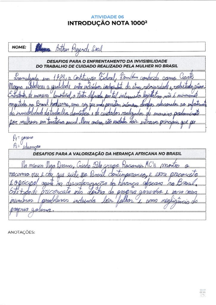 Na Competência 1, observe que você escreveu “mostra” sem concordar com um sujeito claro; o ideal seria “A música ‘Negro Drama’, criada pelo grupo Racionais MC’s, mostra…“. Há erros graves de ortografia e acentuação em palavras como “música“, “herança“, “próprio“, “negligência” e na escrita de “Racionais“. Além disso, evite expressões informais como “este tipo de preconceito está dentro do governo”, preferindo termos como “tal estigma manifesta-se no âmbito governamental”.