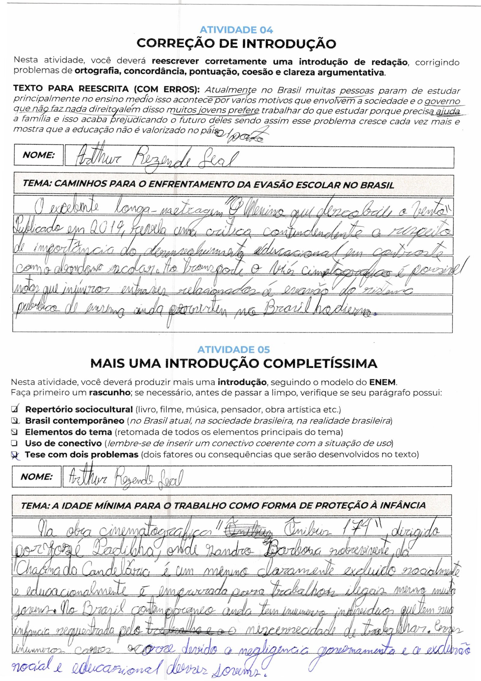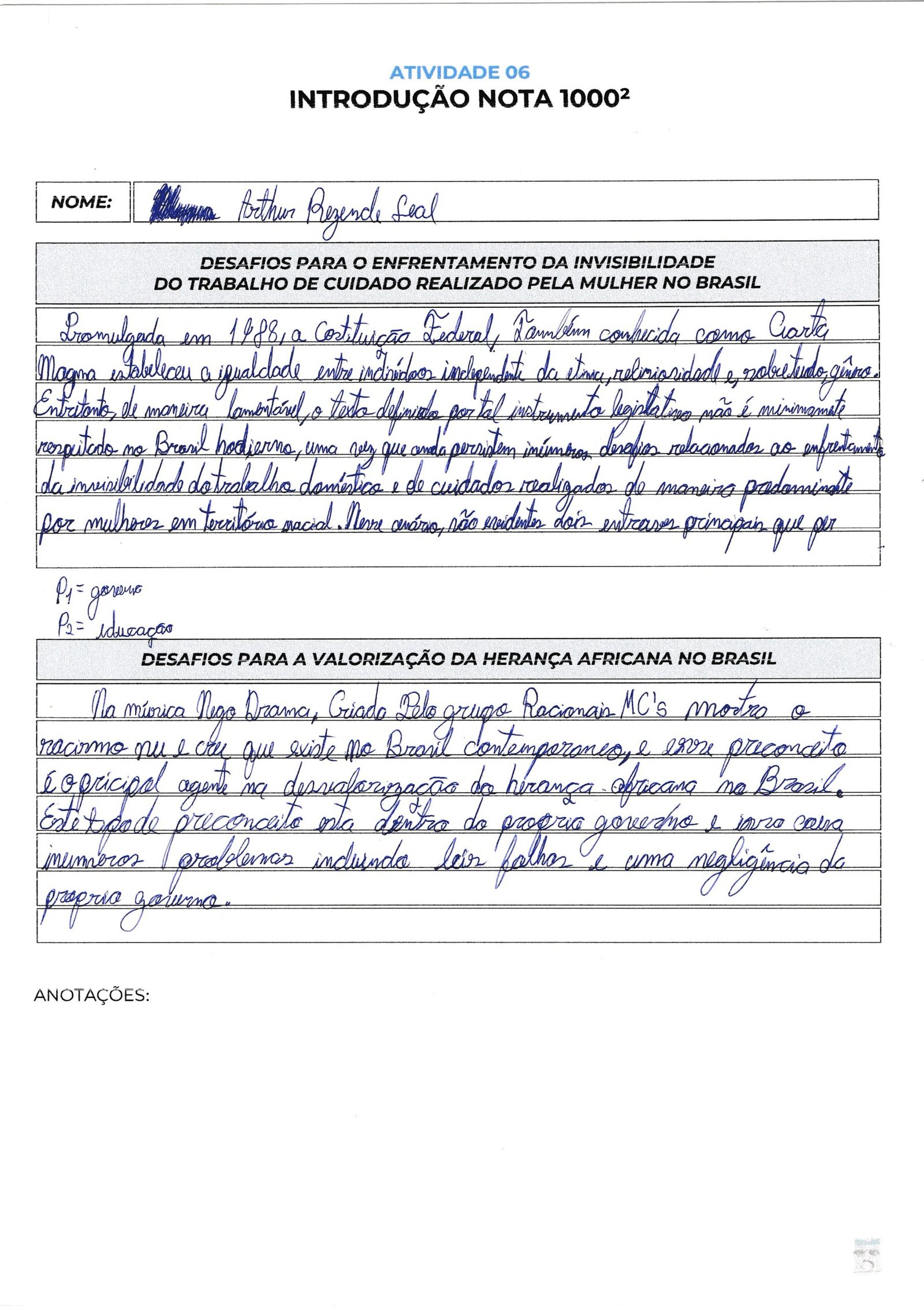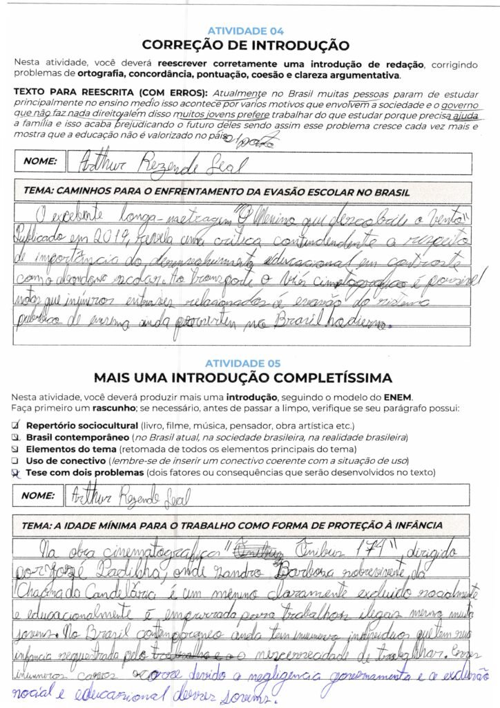 Arthur, sua introdução utiliza um repertório muito pertinente com a música “Negro Drama”, mas apresenta falhas estruturais e gramaticais que prejudicam a nota. Você identificou problemas como leis falhas e negligência governamental, porém a exposição dessas ideias precisa de mais formalidade e correção sintática.