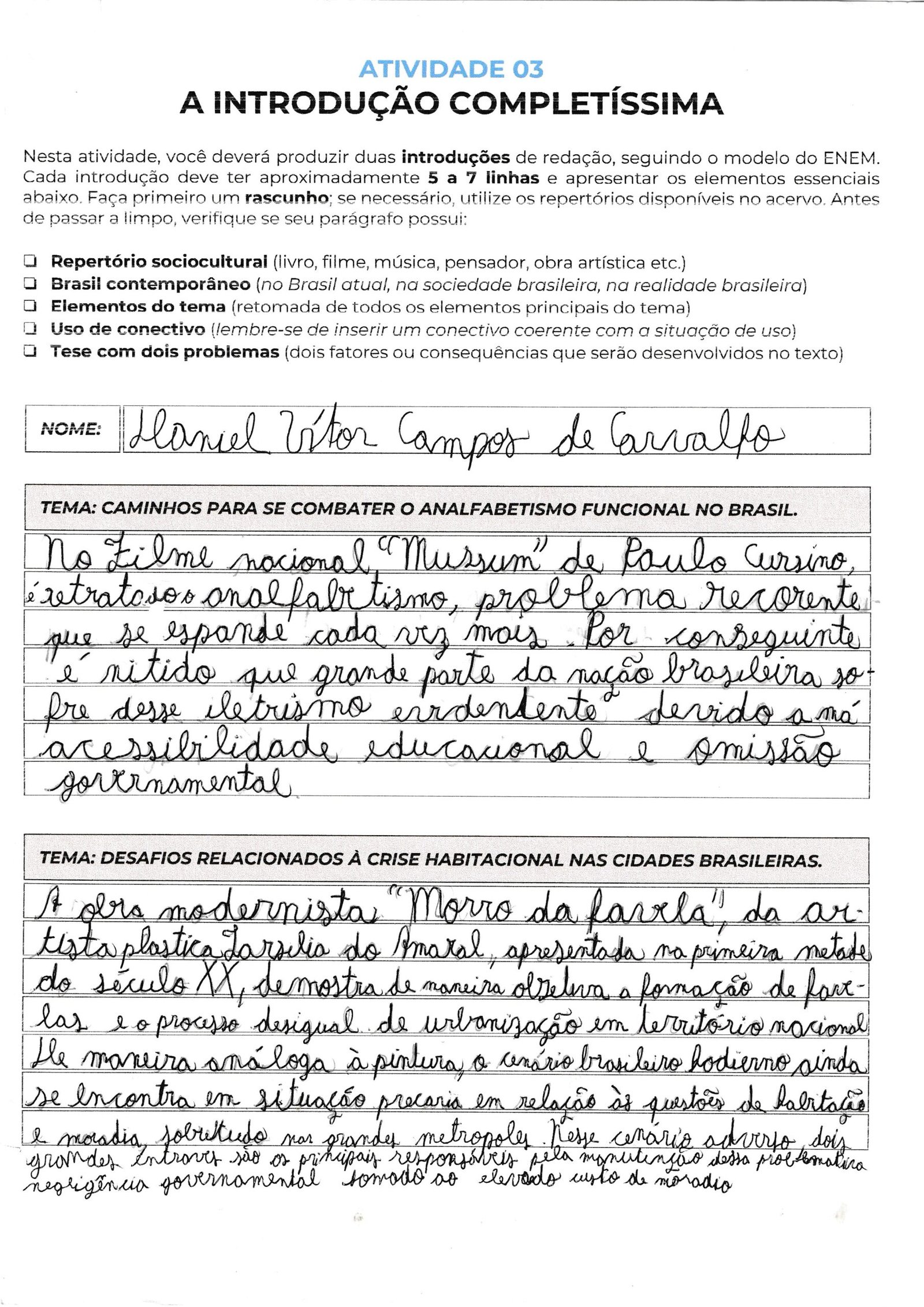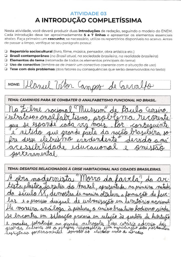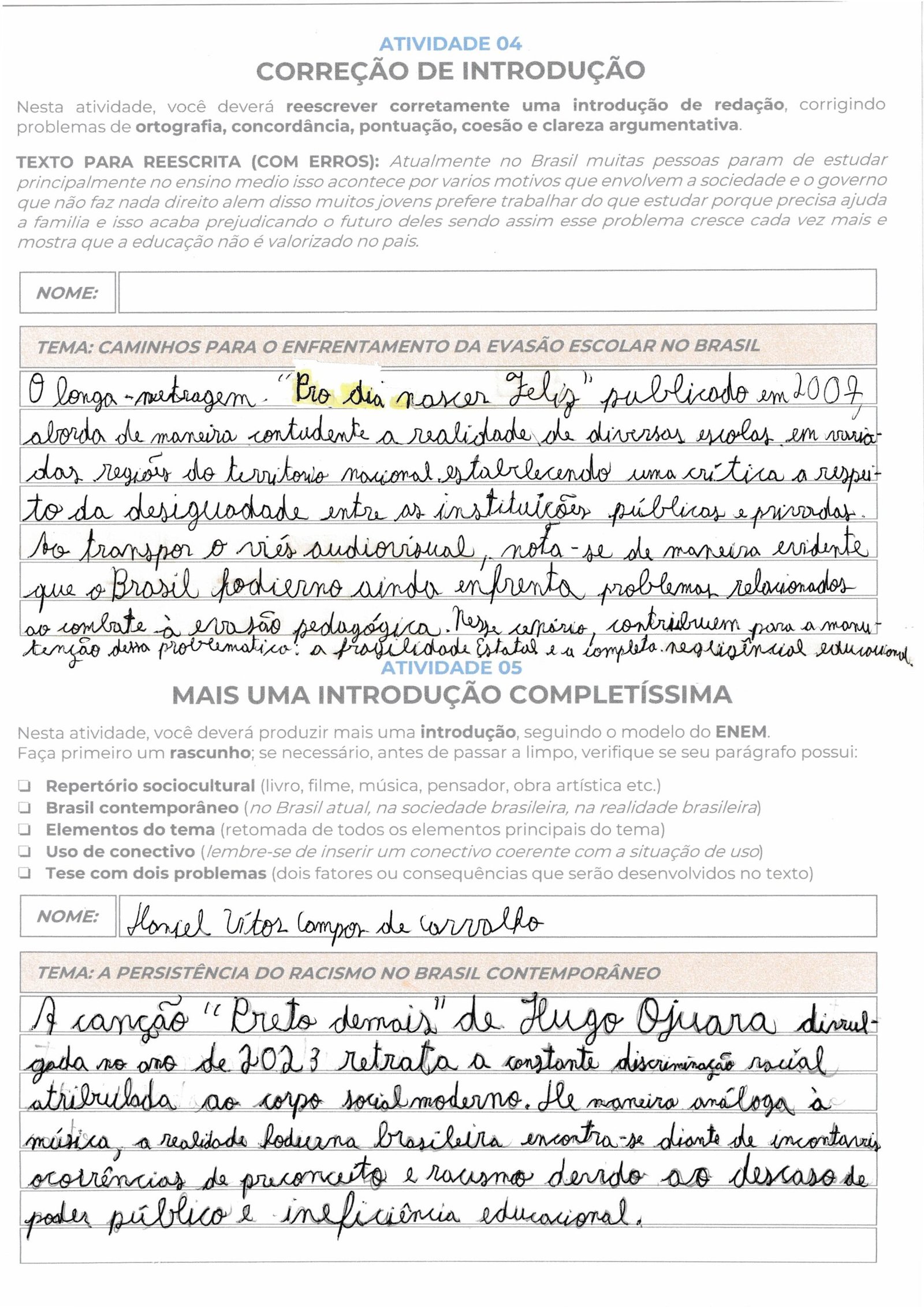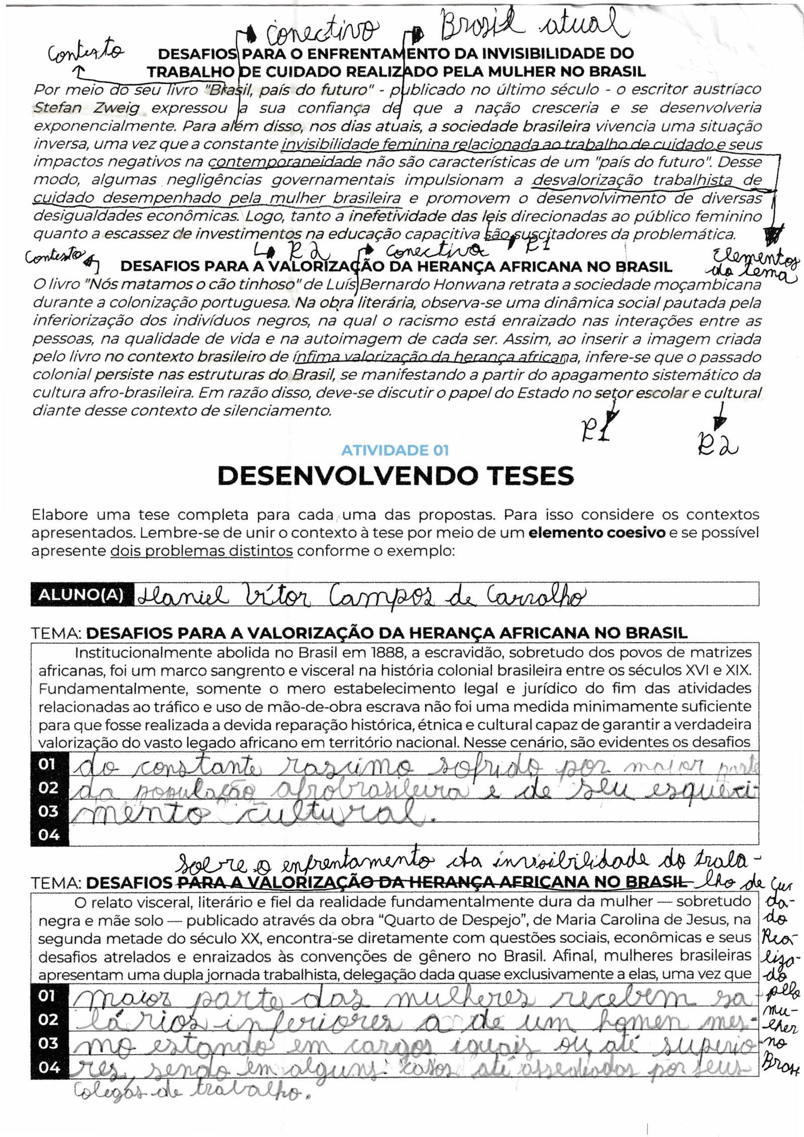 No tema do trabalho de cuidado, você focou na desigualdade salarial e no assédio. Embora sejam problemas reais, o tema pede foco na invisibilidade do cuidado (afazeres domésticos/cuidar de pessoas). Sua tese ficaria mais estratégica assim: “nota-se dois grandes problemas: a naturalização da sobrecarga doméstica feminina e a falta de valorização institucional desse trabalho“.