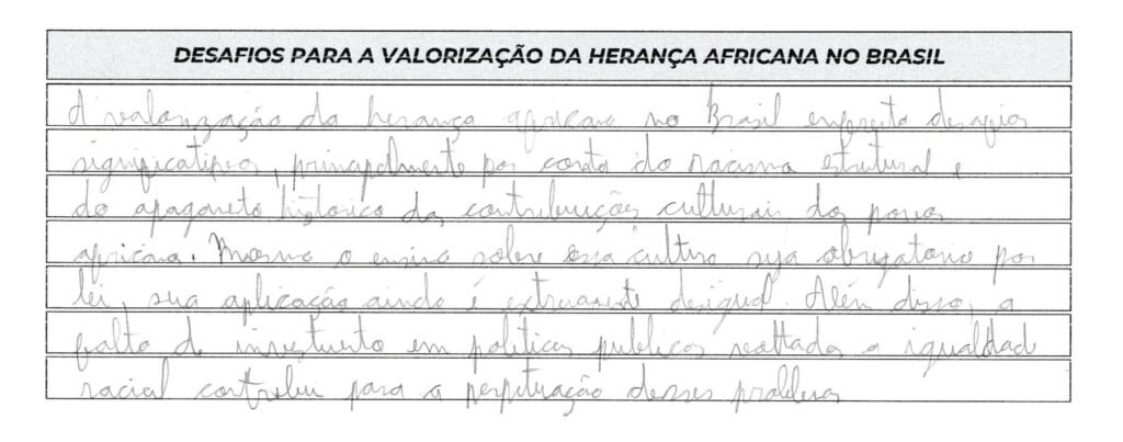 No campo da gramática (Competência 1), observe que você escreveu “por conta do racismo”, que é uma expressão coloquial; prefira “em virtude do” ou “devido ao”. Há também erros de acentuação em “obrigatório” e “políticas“, além de uma falha de concordância em “políticas públicas voltada a igualdade“, onde o correto seria “voltadas à igualdade” (com crase e no plural). Notei que você deixou o primeiro tema em branco, então lembre-se de praticar a conexão entre o repertório e a tese em ambos os cenários.
