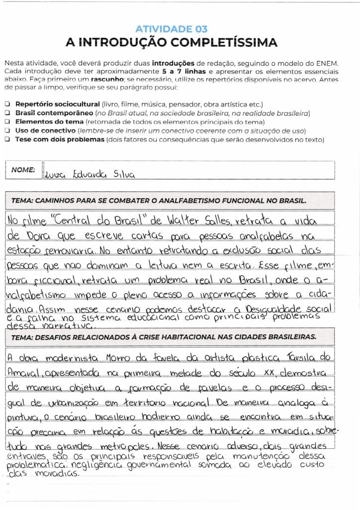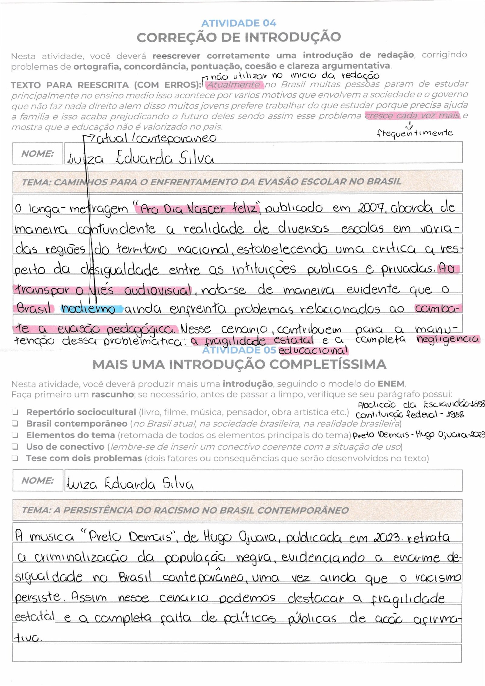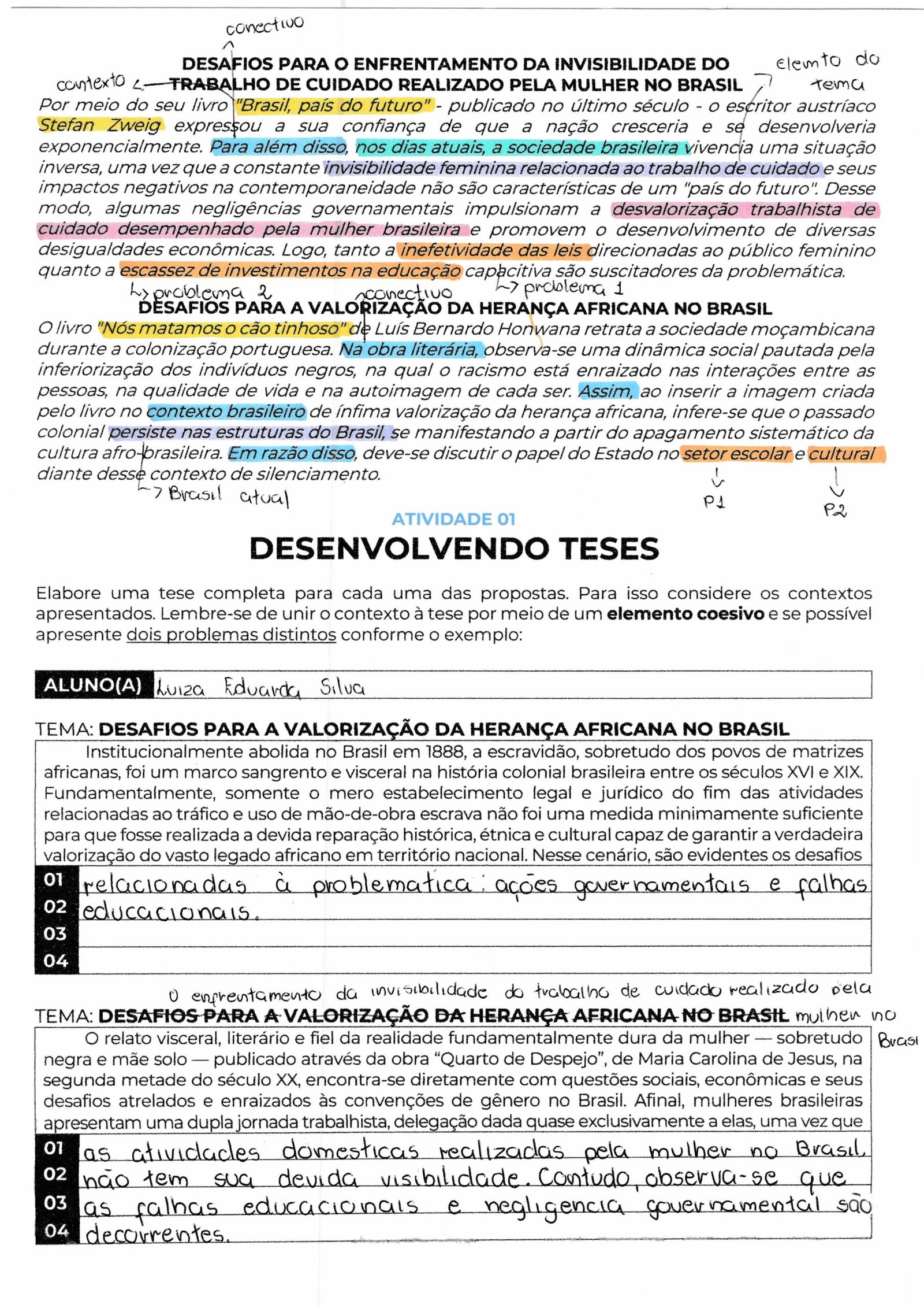 Luiza, suas teses apresentam os dois problemas exigidos de forma clara e identificável. Na primeira proposta, você foca em ações governamentais e falhas educacionais, enquanto na segunda, inspirada pela obra de Maria Carolina de Jesus, você aponta novamente as falhas educacionais e a negligência governamental como causas da invisibilidade do trabalho de cuidado.