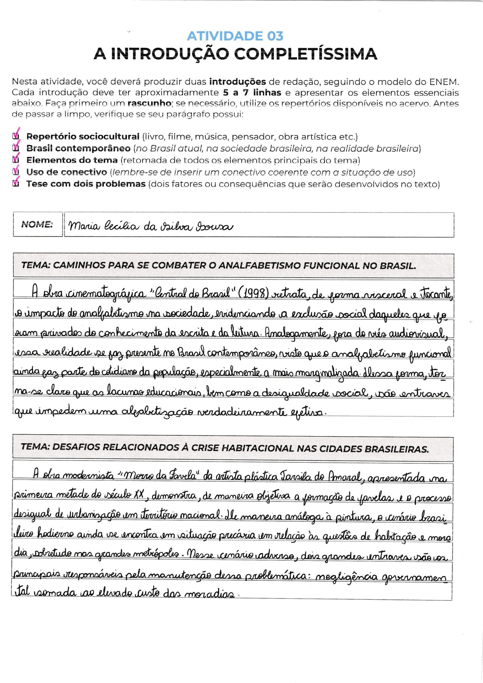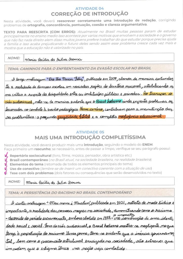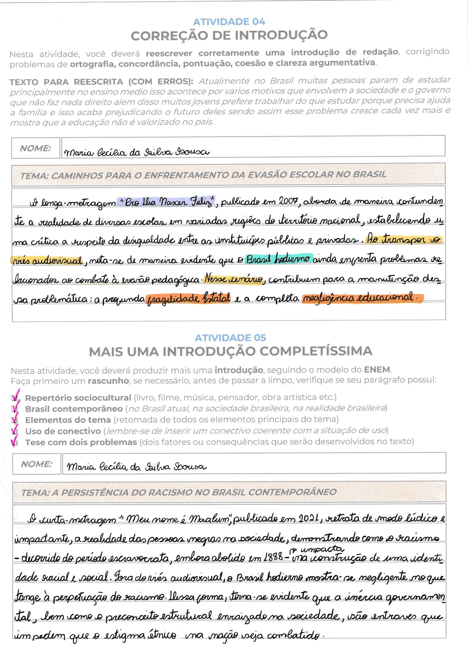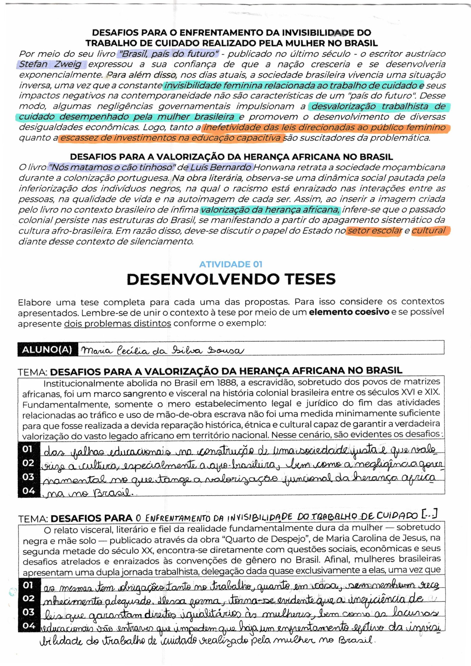 Maria Cecília, suas teses foram bem construídas e atendem perfeitamente ao requisito de serem bipartidas, apresentando dois problemas distintos para cada tema. Na primeira proposta, você identifica com clareza as falhas educacionais e a negligência governamental como os pilares que impedem a valorização da herança africana, estabelecendo uma conexão lógica com o contexto de reparação histórica citado. No segundo tema, você articula muito bem a ineficiência das leis somada às lacunas educacionais, criando um projeto de texto sólido para discutir a invisibilidade do trabalho de cuidado.