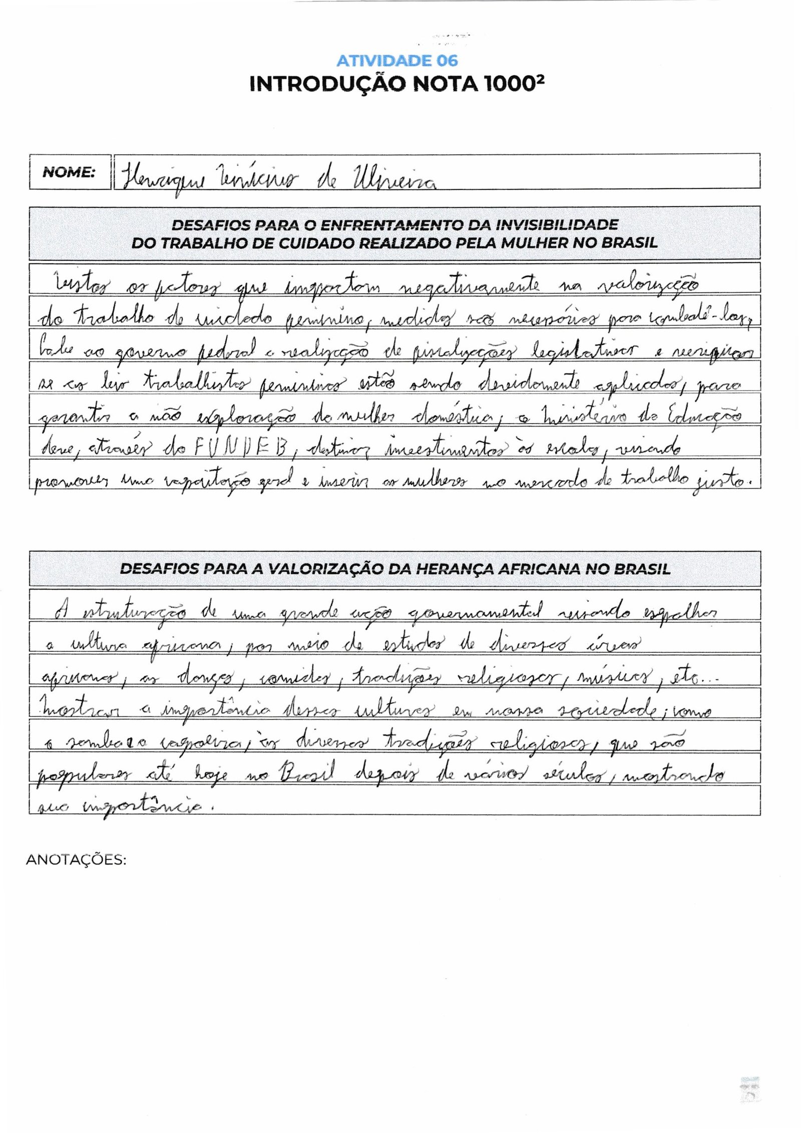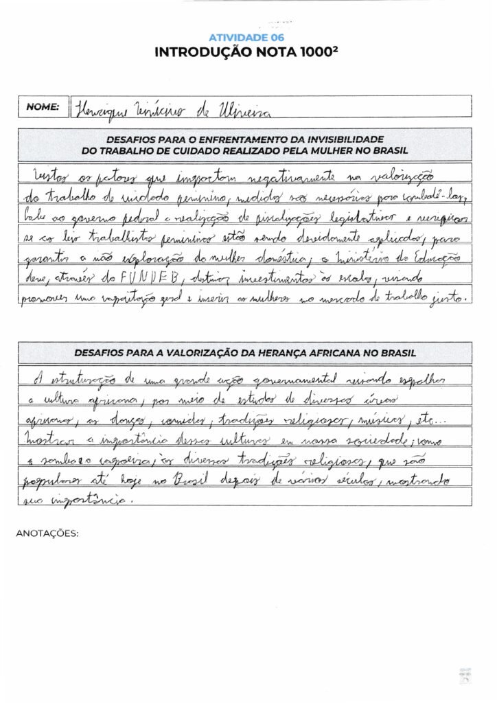 Note que este modelo segue rigorosamente a estrutura do ENEM: comecei com o Repertório (Abolição), usei um Conectivo de transição (Fora do contexto histórico), apresentei o Tema no Brasil atual (desafios da valorização) e finalizei com a Tese Bipartida, apresentando dois problemas claros (falha na educação e racismo estrutural) que você iria explicar nos parágrafos seguintes.